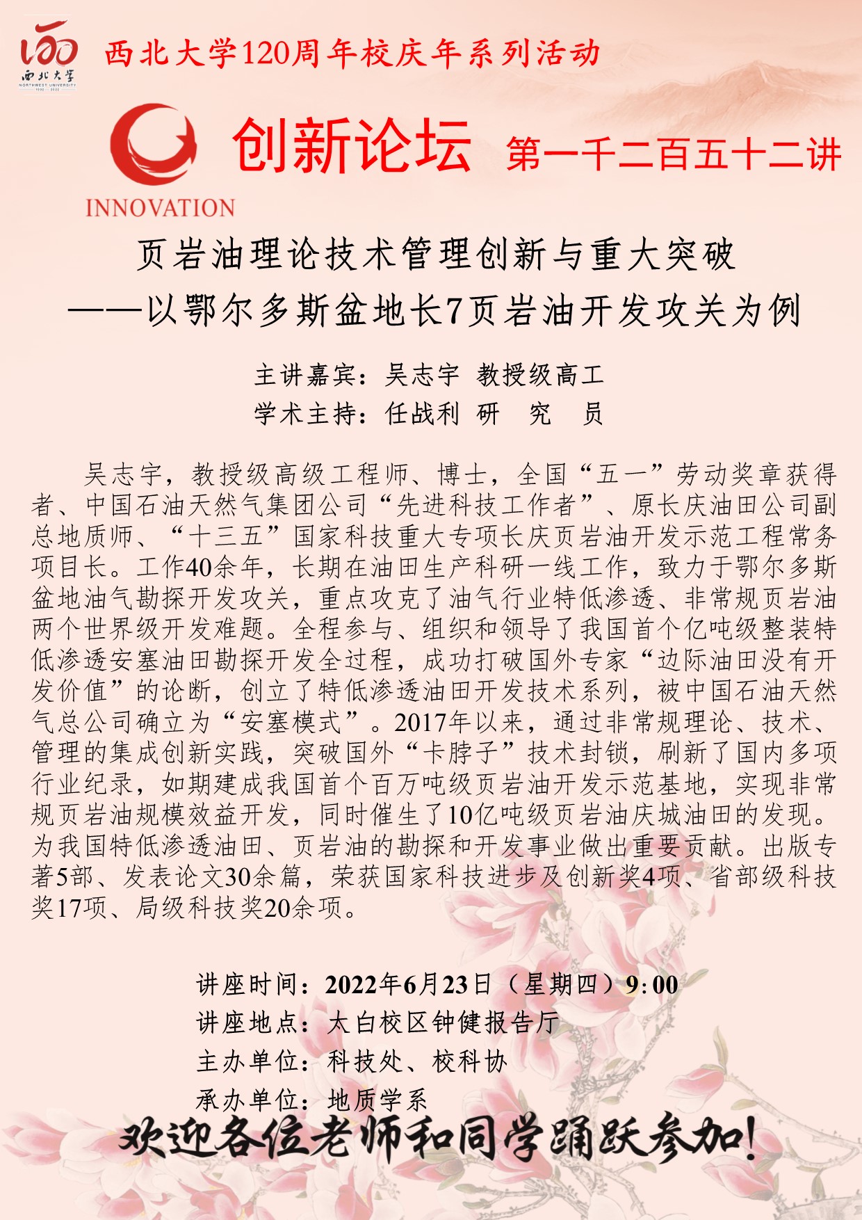 吴志宇 教授级高工 MILAN.COM创新论坛第一千二百五十二讲暨120周年校庆年系列活动:页岩油理论技术管理创新与重大突破——以鄂尔多斯盆地长7页岩油开发攻关为例 讲座时间 2022年6月23日(星期四)9:00 讲座地点 太白校区钟健报告厅 讲座人介绍 吴志宇 教授级高工 讲座内容