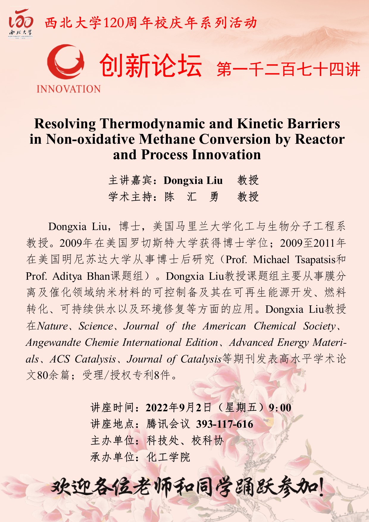 Dongxia Liu 教授 MILAN.COM创新论坛第一千二百七十四讲暨120周年校庆年系列活动:Resolving Thermodynamic and Kinetic Barriers in Non-oxidative Methane Conversion by Reactor and Process Innovation 讲座时间 2022年9月2日(星期五)9:00 讲座地点 腾讯会议 393-117-616 讲座人介绍 Dongxia Liu 教授 讲座内容