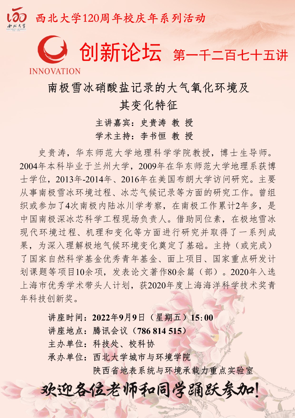 史贵涛 教 授 MILAN.COM创新论坛第一千二百七十五讲暨120周年校庆年系列活动:南极雪冰硝酸盐记录的大气氧化环境及其变化特征 讲座时间 2022年9月9日(星期五)15:00 讲座地点 讲座地点:腾讯会议(786 814 515) 讲座人介绍 史贵涛 教 授 讲座内容
