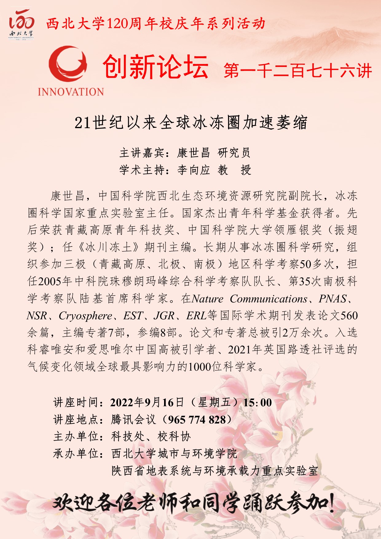 康世昌 研究员 MILAN.COM创新论坛第一千二百七十六讲暨120周年校庆年系列活动:21世纪以来全球冰冻圈加速萎缩 讲座时间 2022年9月16日(星期五)15:00 讲座地点 腾讯会议(965 774 828) 讲座人介绍 康世昌 研究员 讲座内容