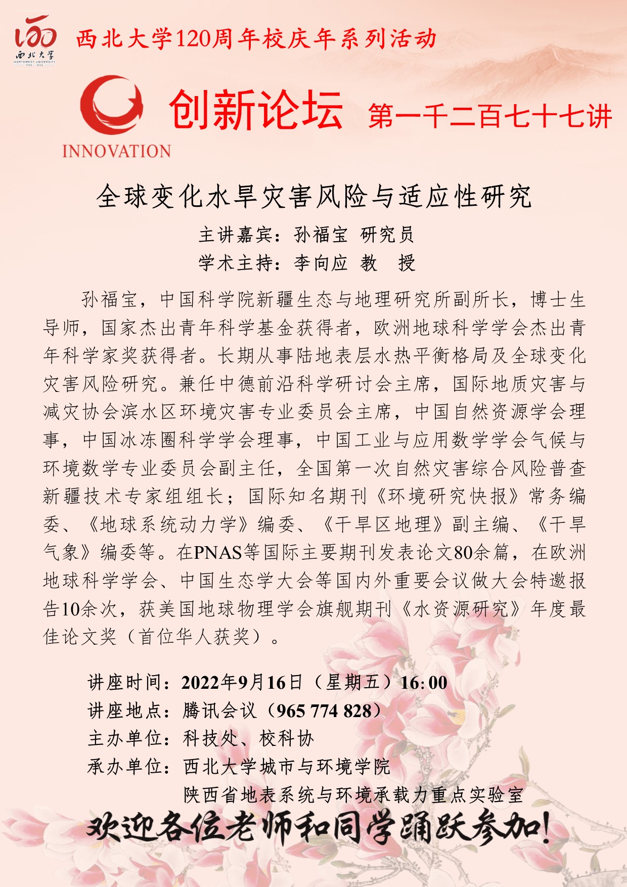 孙福宝 研究员 MILAN.COM创新论坛第一千二百七十七讲暨120周年校庆年系列活动:全球变化水旱灾害风险与适应性研究 讲座时间 2022年9月16日(星期五)16:00 讲座地点 腾讯会议(965 774 828) 讲座人介绍 孙福宝 研究员 讲座内容