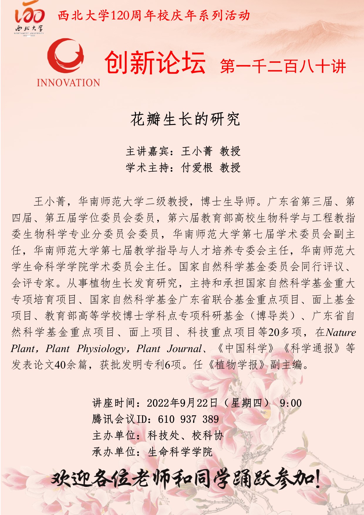 王小菁 教授 MILAN.COM创新论坛第一千二百八十讲暨120周年校庆年系列活动:花瓣生长的研究 讲座时间 2022年9月22日(星期四) 9:00 讲座地点 腾讯会议ID:610 937 389 讲座人介绍 王小菁 教授 讲座内容
