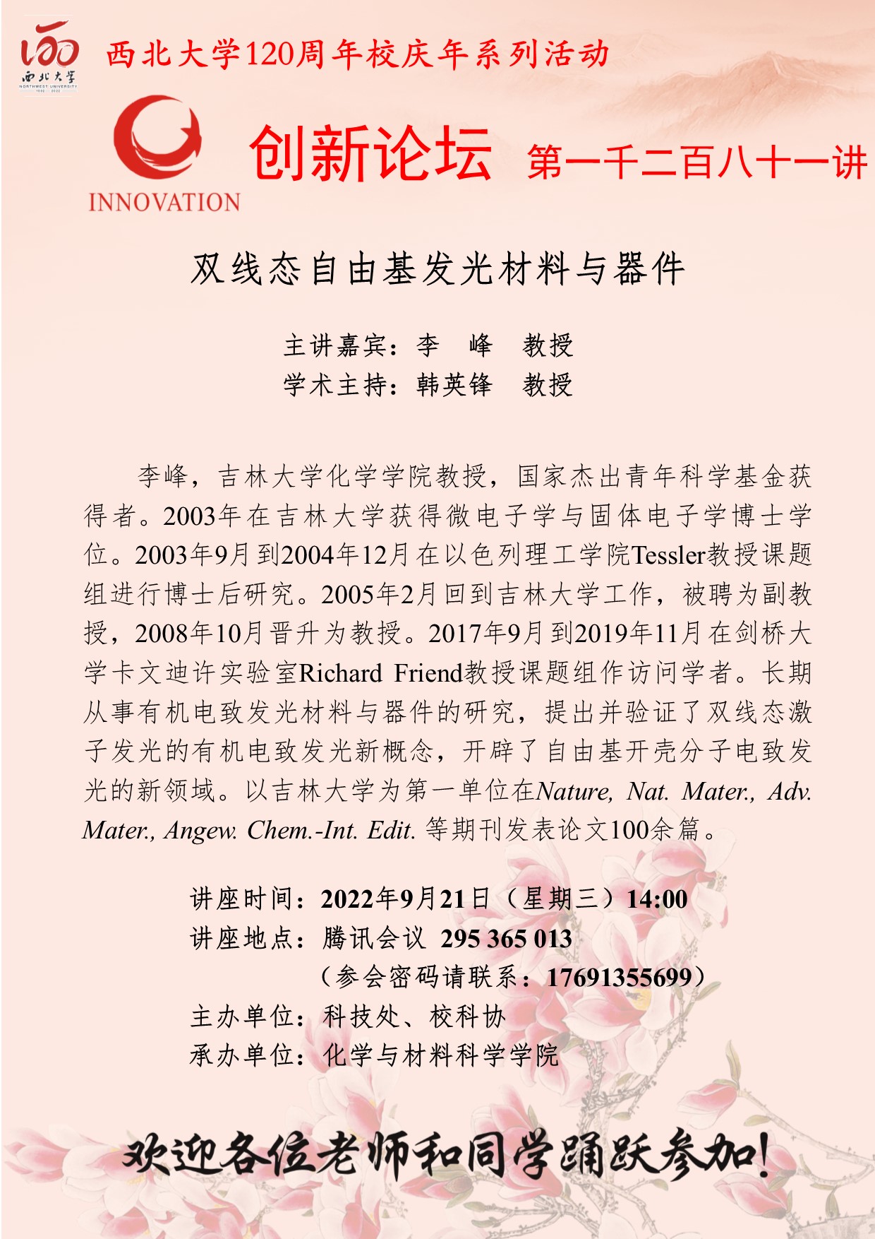 李峰 教授 MILAN.COM创新论坛第一千二百八十一讲暨120周年校庆年系列活动: 双线态自由基发光材料与器件 讲座时间 2022年9月21日(星期三) 14:00 讲座地点 腾讯会议ID:295 365 013 (参会密码请联系:17691355699) 讲座人介绍 李峰 教授 讲座内容