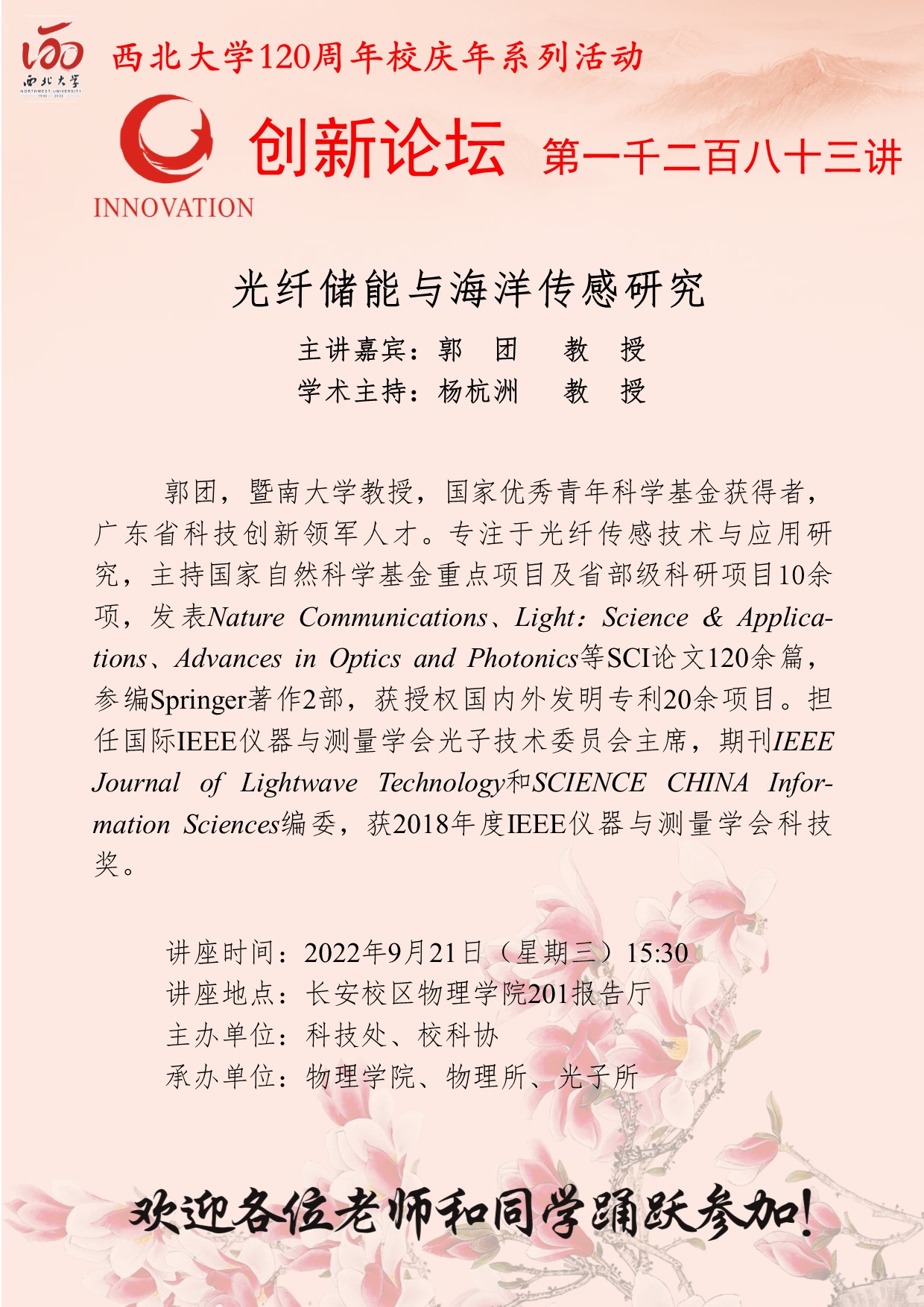 郭团 教授 MILAN.COM创新论坛第一千二百八十三讲暨120周年校庆年系列活动::光纤储能与海洋传感研究 讲座时间 2022年9月21日(星期三) 15:30 讲座地点 物理学院201报告厅 讲座人介绍 郭团 教授 讲座内容