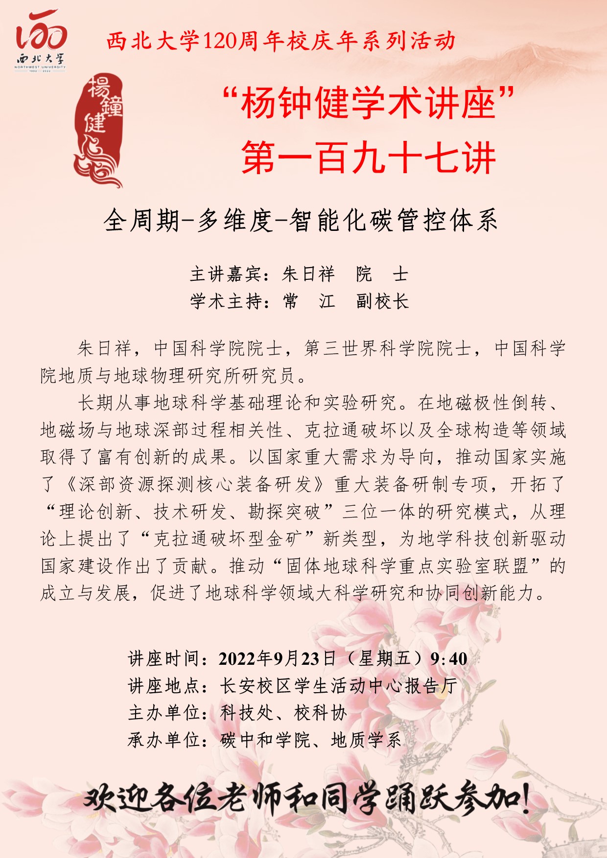 朱日祥 院士 “杨钟健学术讲座”第一百九十七讲暨120周年校庆年系列活动:全周期-多维度-智能化碳管控体系 讲座时间 2022年9月23日(星期五)9:40 讲座地点 长安校区学生活动中心报告厅 讲座人介绍 朱日祥 院士 讲座内容