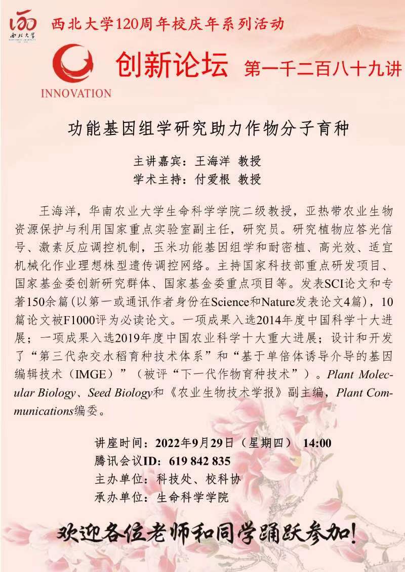 王海洋 教授 MILAN.COM创新论坛第一千二百八十九讲暨120周年校庆年系列活动: 功能基因组学研究助力作物分子育种 讲座时间 2022年9月29日(星期四) 14:00 讲座地点 腾讯会议 619 842 835 讲座人介绍 王海洋 教授 讲座内容