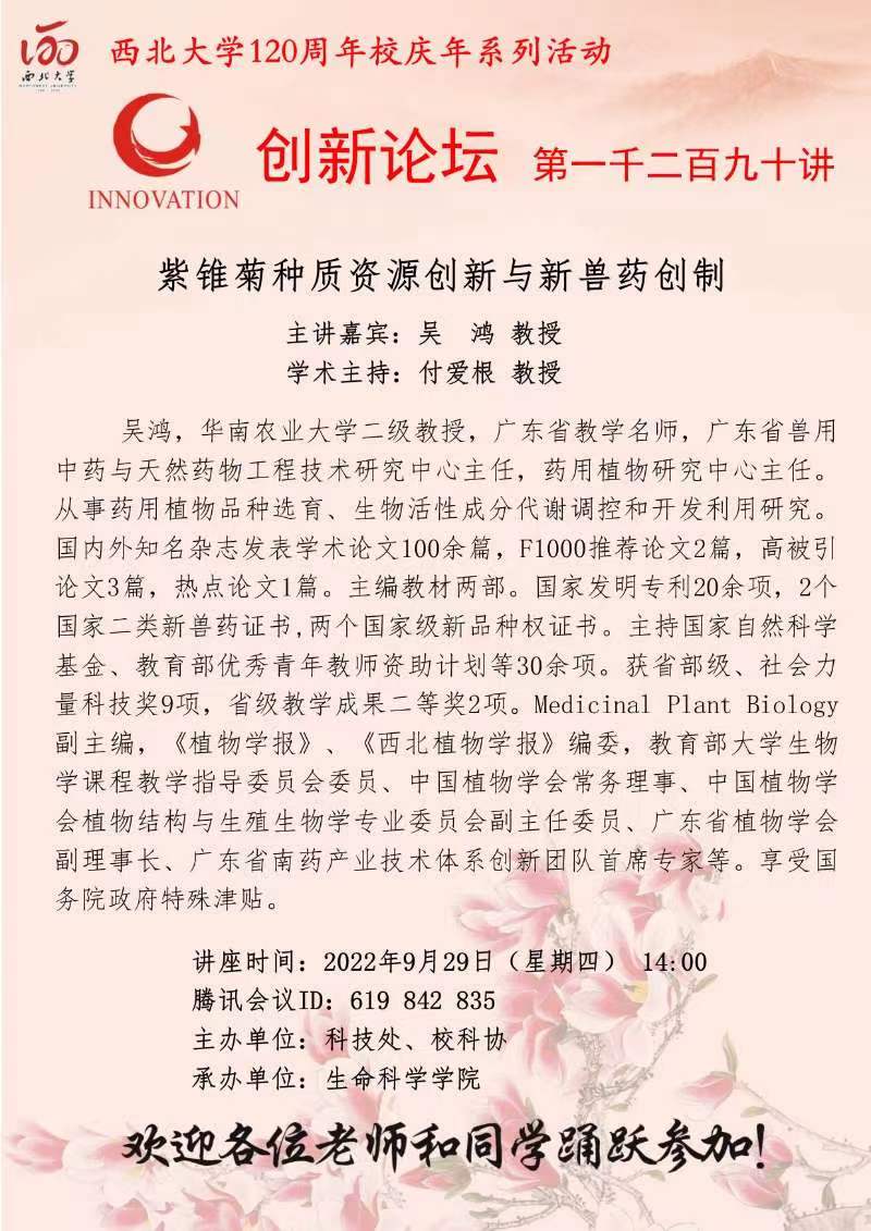 吴 鸿 教授 MILAN.COM创新论坛第一千二百九十讲暨120周年校庆年系列活动: 紫锥菊种质资源创新与新兽药创制 讲座时间 2022年9月29日(星期四) 14:00 讲座地点 腾讯会议 619 842 835 讲座人介绍 吴 鸿 教授 讲座内容