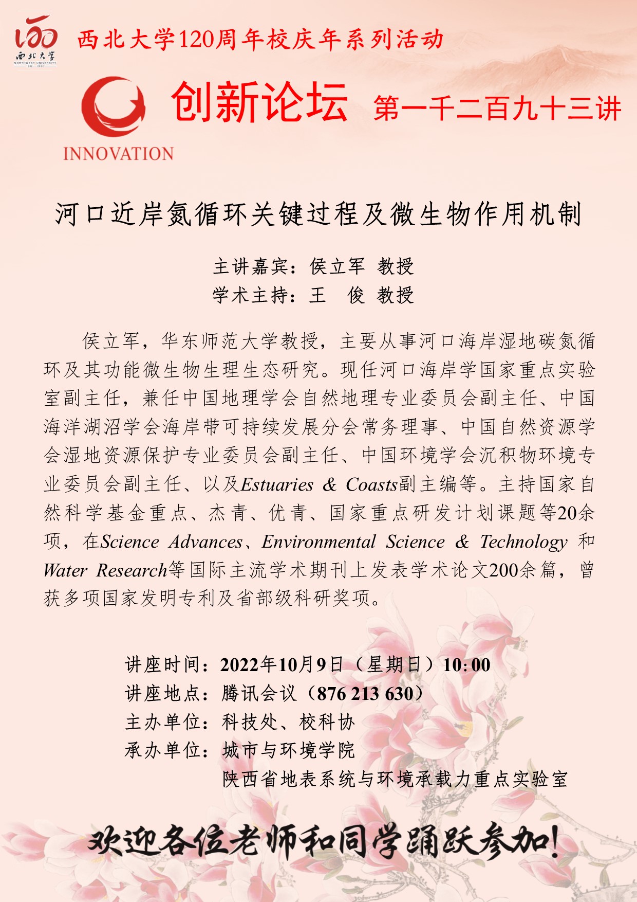 侯立军 教授 MILAN.COM创新论坛第一千二百九十三讲暨120周年校庆年系列活动: 河口近岸氮循环关键过程及微生物作用机制 讲座时间 2022年10月9日(星期日)10:00 讲座地点 腾讯会议(876 213 630) 讲座人介绍 侯立军 教授 讲座内容