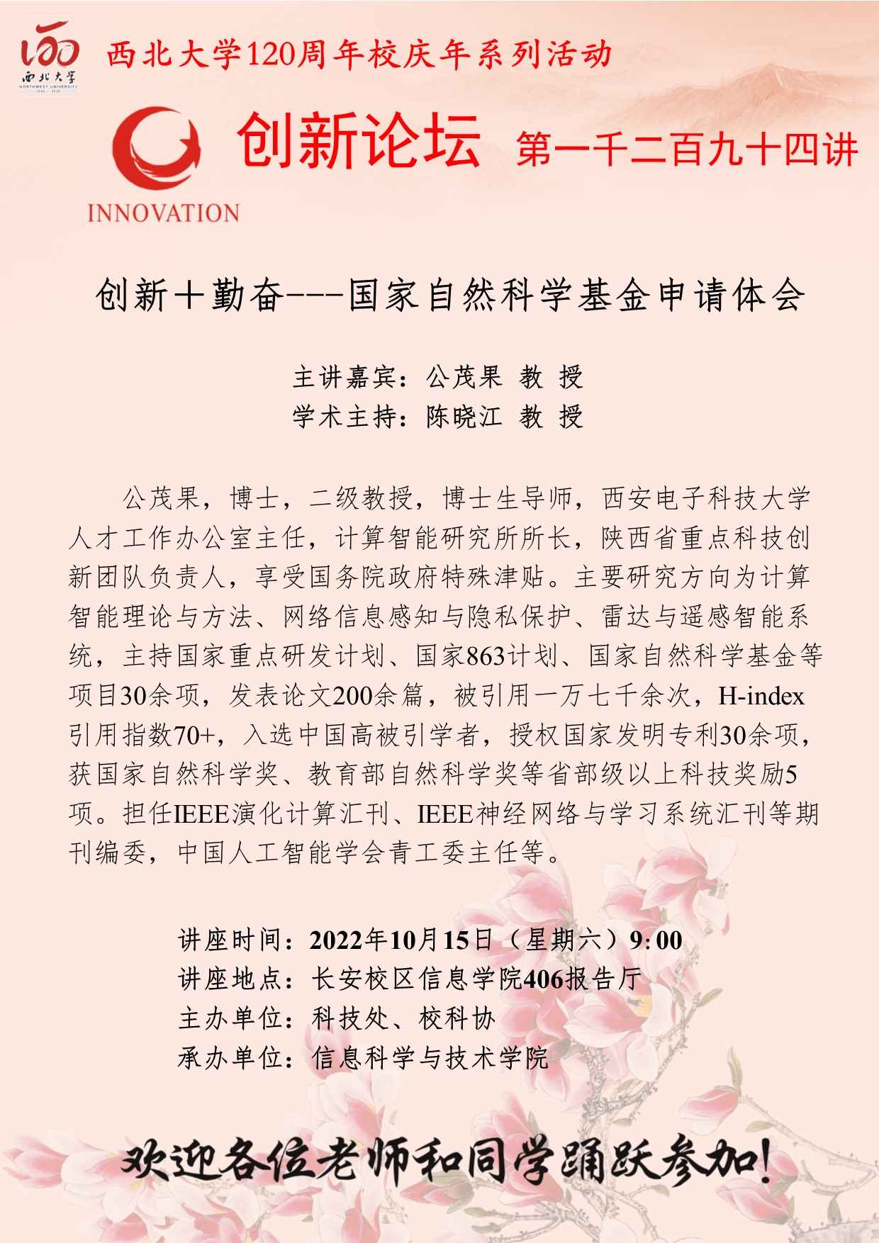 公茂果 教授 MILAN.COM创新论坛第一千二百九十四讲暨120周年校庆年系列活动: 创新+勤奋——国家自然科学基金申请体会 讲座时间 2022年10月15日(星期六)9:00 讲座地点 长安校区信息学院406报告厅 讲座人介绍 公茂果 教授 讲座内容