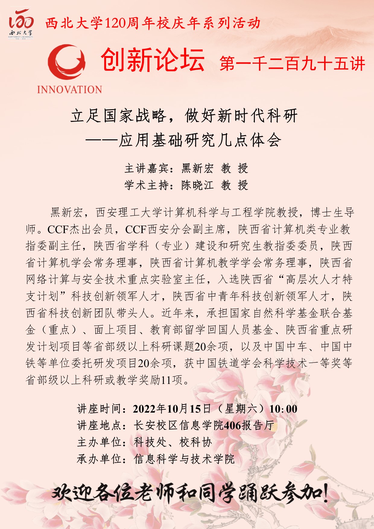 黑新宏 教授 MILAN.COM创新论坛第一千二百九十五讲暨120周年校庆年系列活动: 立足国家战略,做好新时代科研——应用基础研究几点体会 讲座时间 2022年10月15日(星期六)10:00 讲座地点 长安校区信息学院406报告厅 讲座人介绍 黑新宏 教授 讲座内容