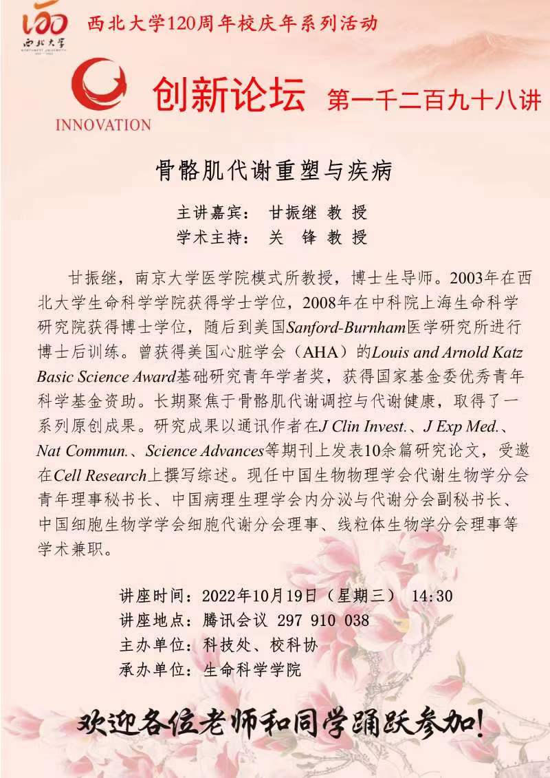 甘振继 教授 MILAN.COM创新论坛第一千二百九十八讲暨120周年校庆年系列活动: 骨骼肌代谢重塑与疾病 讲座时间 2022年10月19日(星期三) 14:30 讲座地点 腾讯会议 297 910 038 讲座人介绍 甘振继 教授 讲座内容
