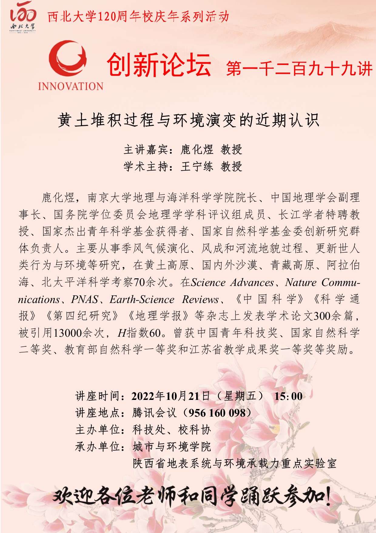 鹿化煜 教授 MILAN.COM创新论坛第一千二百九十九讲暨120周年校庆年系列活动:黄土堆积过程与环境演变的近期认识 讲座时间 2022年10月21日(星期五) 15:00 讲座地点 腾讯会议(956 160 098) 讲座人介绍 鹿化煜 教授 讲座内容