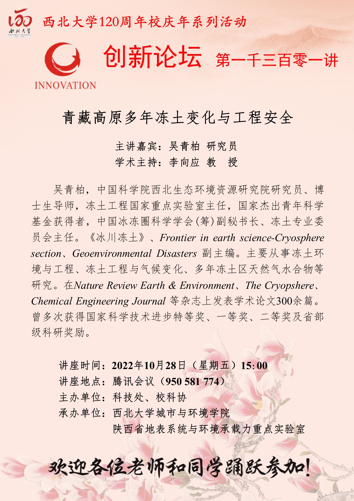 吴青柏 研究员 MILAN.COM创新论坛第一千三百零一讲暨120周年校庆年系列活动: 青藏高原多年冻土变化与工程安全 讲座时间 2022年10月28日(星期五)15:00 讲座地点 腾讯会议 950 581 774 讲座人介绍 吴青柏 研究员 讲座内容