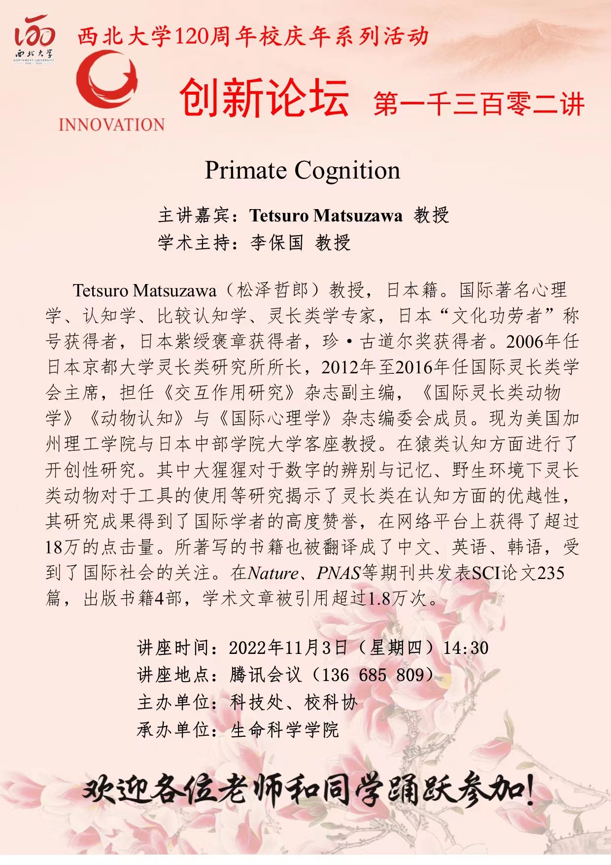 Tetsuro Matsuzawa 教授 MILAN.COM创新论坛第一千三百零二讲暨120周年校庆年系列活动: Primate Cognition 讲座时间 2022年11月3日(星期四)14:30 讲座地点 腾讯会议 136 685 809 讲座人介绍 Tetsuro Matsuzawa 教授 讲座内容