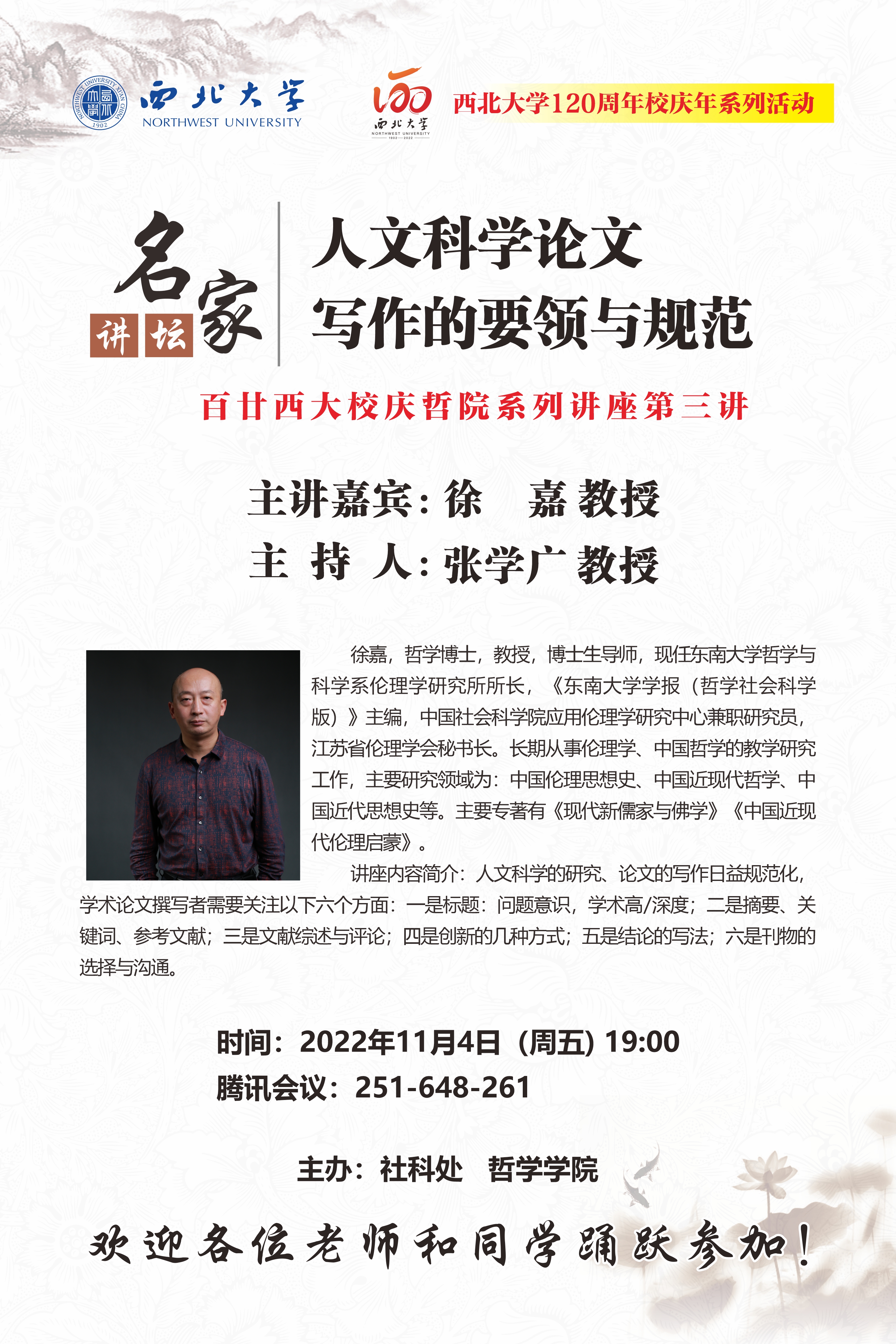 徐嘉 教授 名家讲坛暨120周年校庆年系列活动:人文科学论文写作的要领与规范 讲座时间 2022年11月4日(周五)19:00 讲座地点 腾讯会议:251-648-261 讲座人介绍 徐嘉 教授 讲座内容
