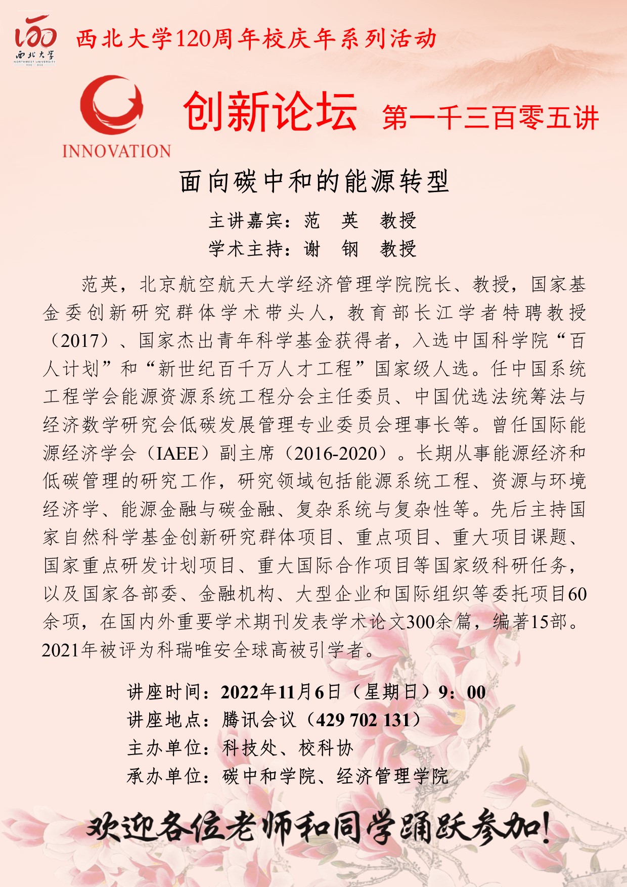 范英 教授 MILAN.COM创新论坛第一千三百零五讲暨120周年校庆年系列活动: 面向碳中和的能源转型 讲座时间 2022年11月6日(星期日)9:00 讲座地点 腾讯会议(429 702 131) 讲座人介绍 范英 教授 讲座内容