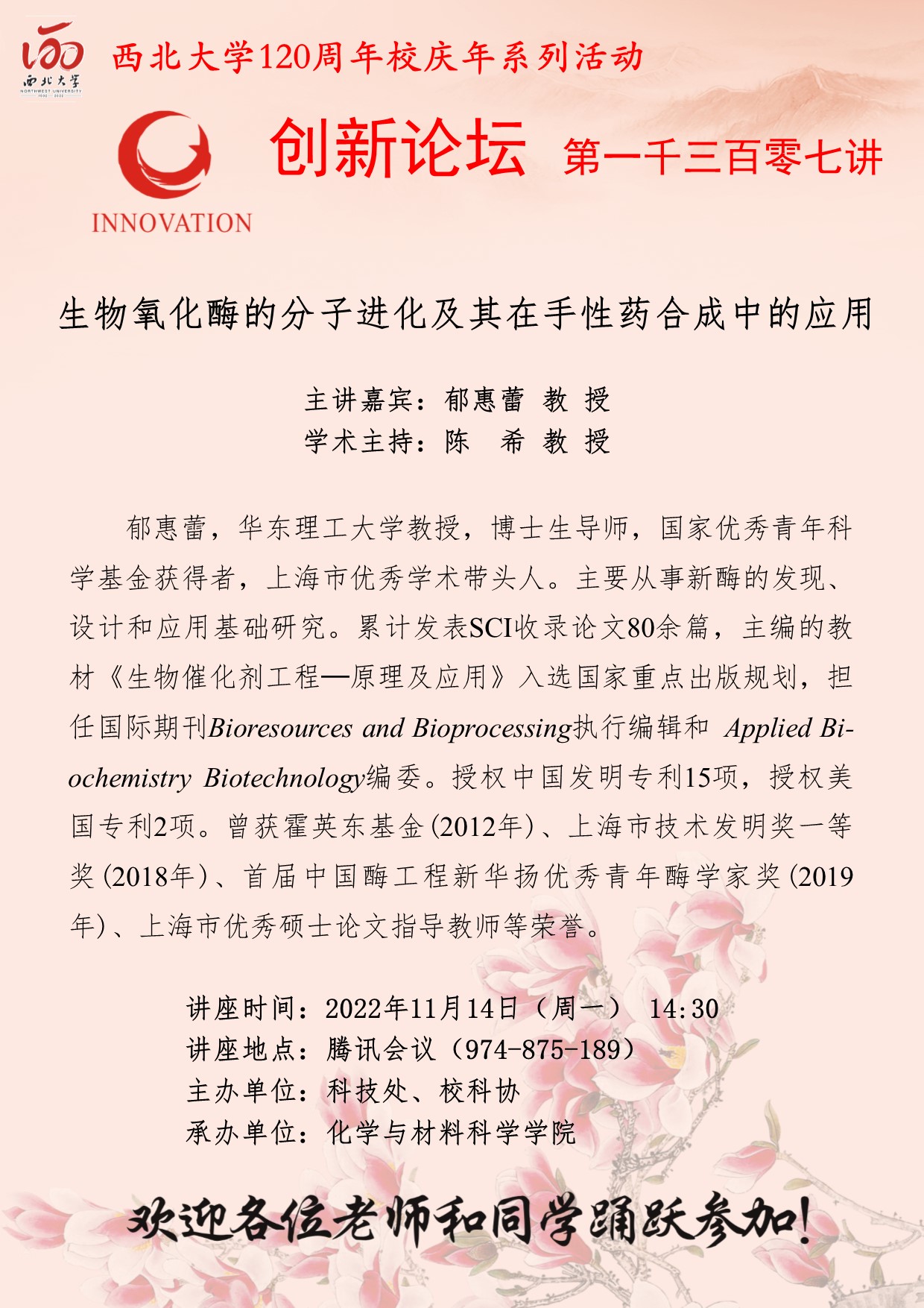 郁惠蕾 教授 MILAN.COM创新论坛第一千三百零七讲暨120周年校庆年系列活动: 生物氧化酶的分子进化及其在手性药合成中的应用 讲座时间 2022年11月14日(星期一)14:30 讲座地点 腾讯会议(974 875 189) 讲座人介绍 郁惠蕾 教授 讲座内容