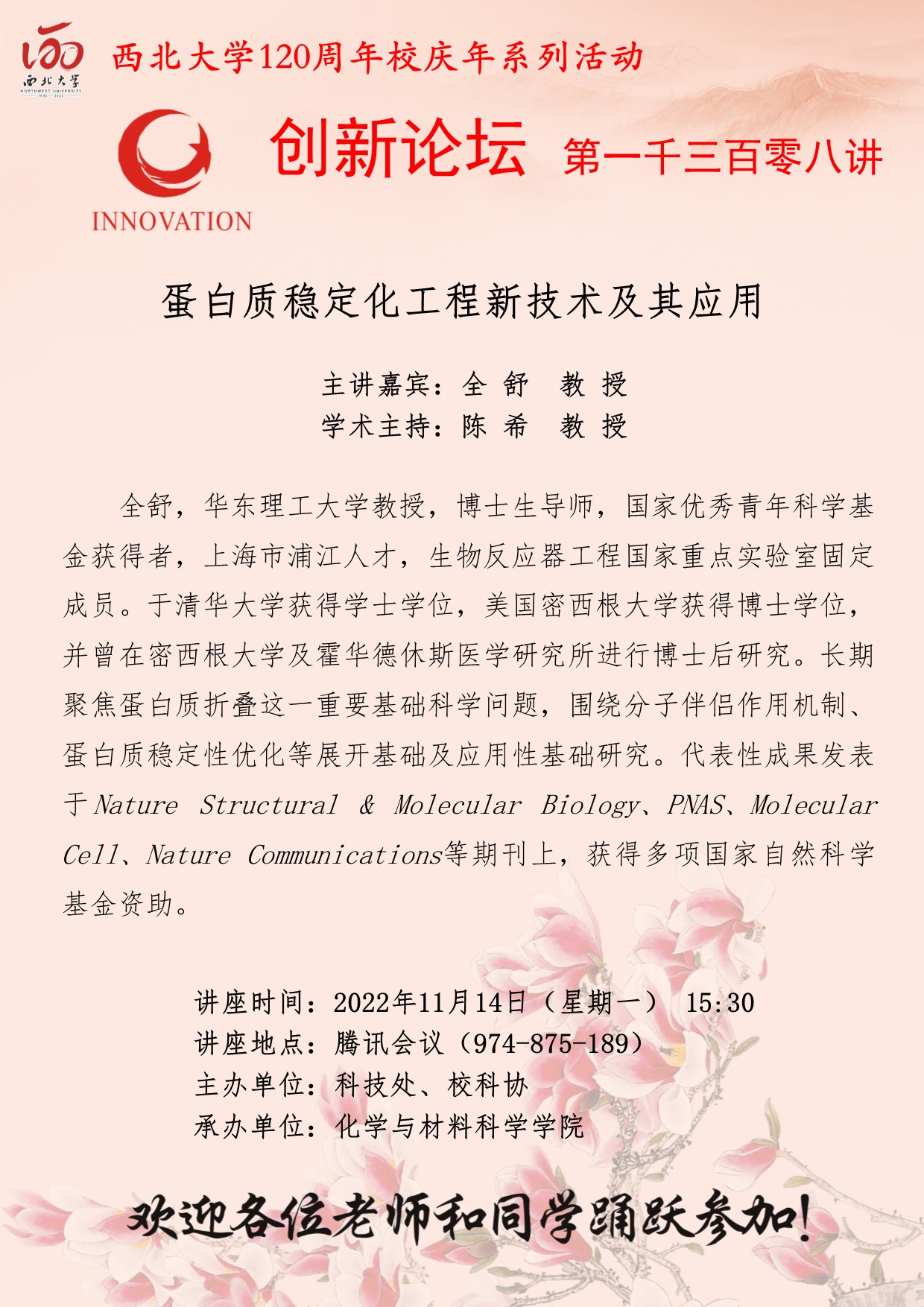 全舒 教授 MILAN.COM创新论坛第一千三百零八讲暨120周年校庆年系列活动: 蛋白质稳定化工程新技术及其应用 讲座时间 2022年11月14日(星期一)15:30 讲座地点 腾讯会议(974 875 189) 讲座人介绍 全舒 教授 讲座内容