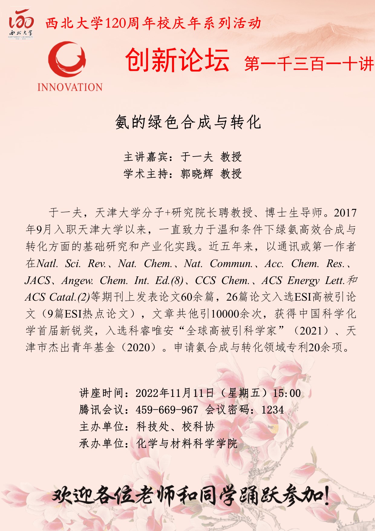 于一夫 教授 MILAN.COM创新论坛第一千三百一十讲暨120周年校庆年系列活动: 氨的绿色合成与转化 讲座时间 2022年11月11日(星期五)15:00 讲座地点 腾讯会议(459-669-967) 密码 1234 讲座人介绍 于一夫 教授 讲座内容