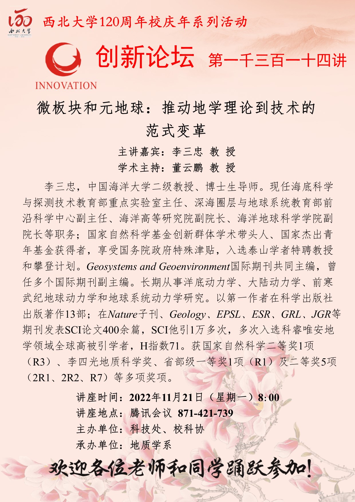 李三忠 教授 MILAN.COM创新论坛第一千三百一十四讲暨120周年校庆年系列活动: 微板块和元地球:推动地学理论到技术的范式变革 讲座时间 2022年11月21日(星期一)8:00 讲座地点 腾讯会议(871-421-739) 讲座人介绍 李三忠 教授 讲座内容