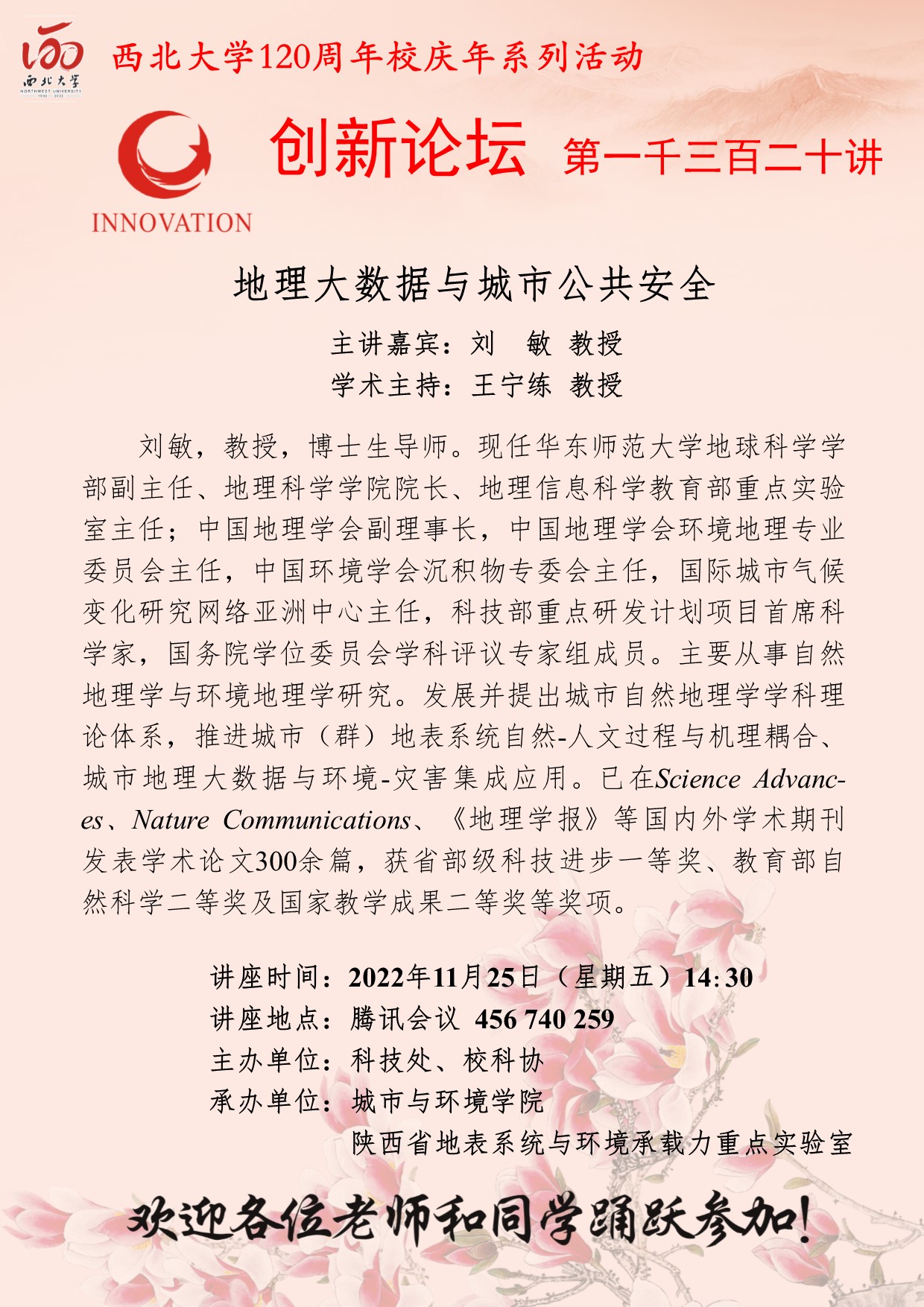 刘敏 教授 MILAN.COM创新论坛第一千三百二十讲暨120周年校庆年系列活动: 地理大数据与城市公共安全 讲座时间 2022年11月25日(星期五)14:30 讲座地点 腾讯会议 456 740 259 讲座人介绍 刘敏 教授 讲座内容