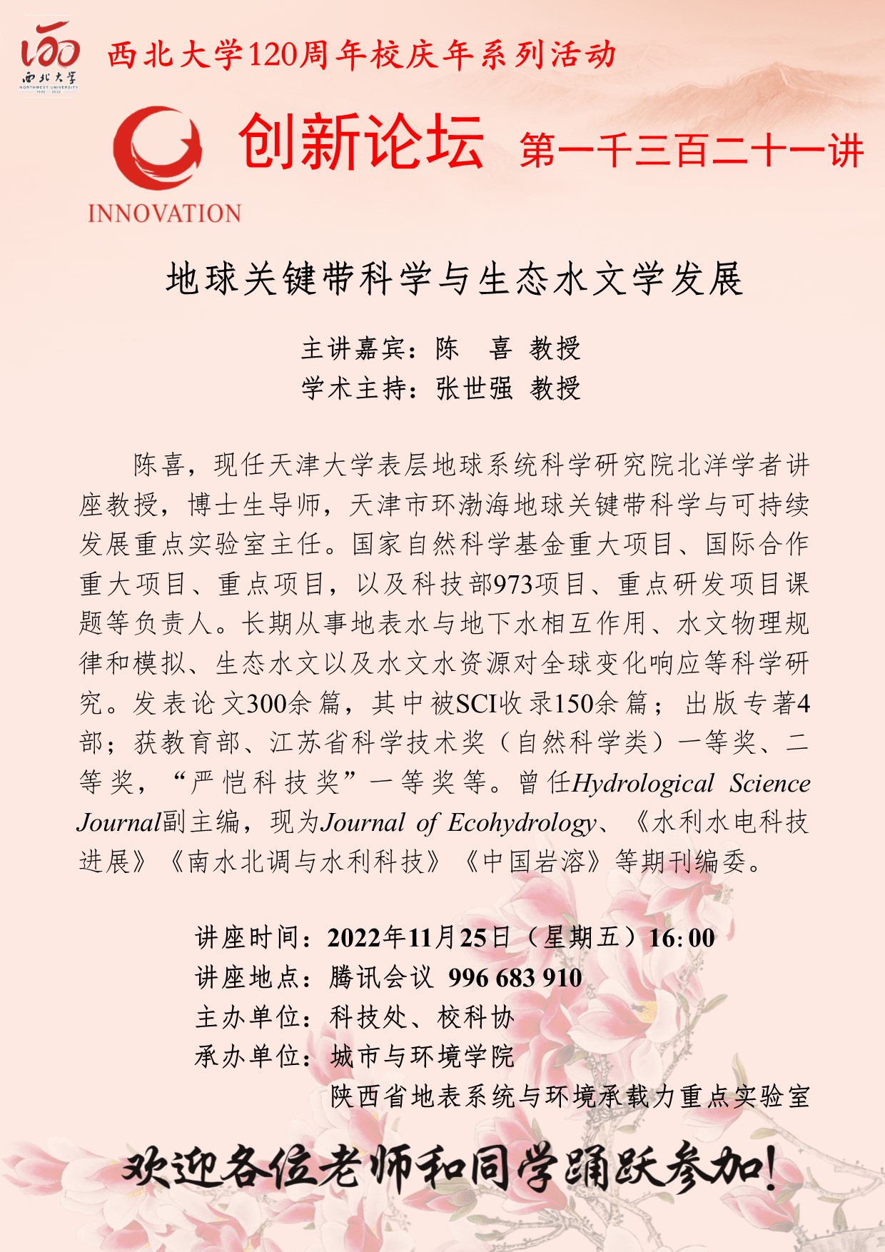 陈喜 教授 MILAN.COM创新论坛第一千三百二十一讲暨120周年校庆年系列活动:地球关键带科学与生态水文学发展 讲座时间 2022年11月25日(星期五)16:00 讲座地点 腾讯会议 996 683 910 讲座人介绍 陈喜 教授 讲座内容