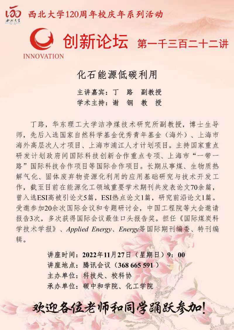 丁路 副教授 MILAN.COM创新论坛第一千三百二十二讲暨120周年校庆年系列活动: 化石能源低碳利用 讲座时间 2022年11月27日(星期日) 9:00 讲座地点 腾讯会议368 665 591 讲座人介绍 丁路 副教授 讲座内容