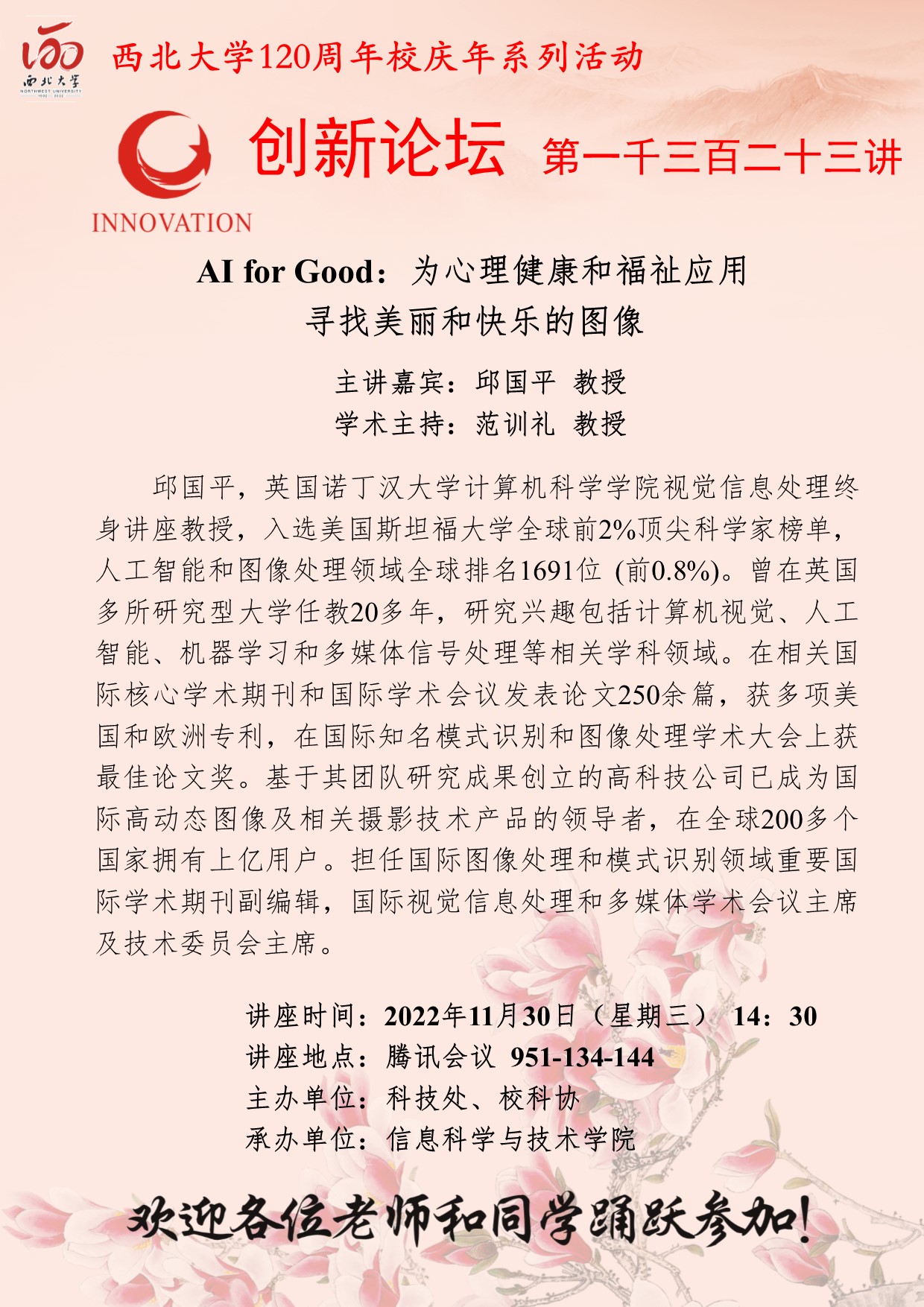 邱国平 教授 MILAN.COM创新论坛第一千三百二十三讲暨120周年校庆年系列活动:AI for Good:为心理健康和福祉应用寻找美丽和快乐的图像 讲座时间 2022年11月30日(星期三) 14:30 讲座地点 腾讯会议 951-134-144 讲座人介绍 邱国平 教授 讲座内容