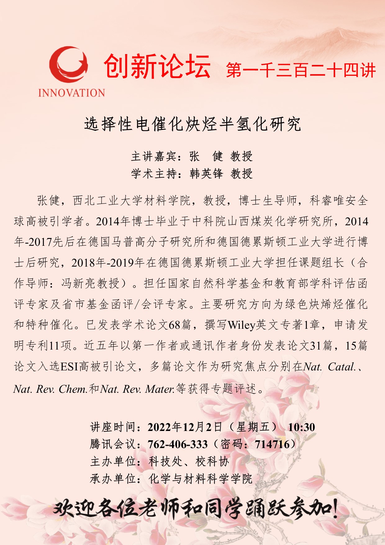 张 健 教授 MILAN.COM创新论坛第一千三百二十四讲:选择性电催化炔烃半氢化研究 讲座时间 2022年12月2日(星期五) 10:30 讲座地点 腾讯会议762-406-333(密码:714716) 讲座人介绍 张 健 教授 讲座内容