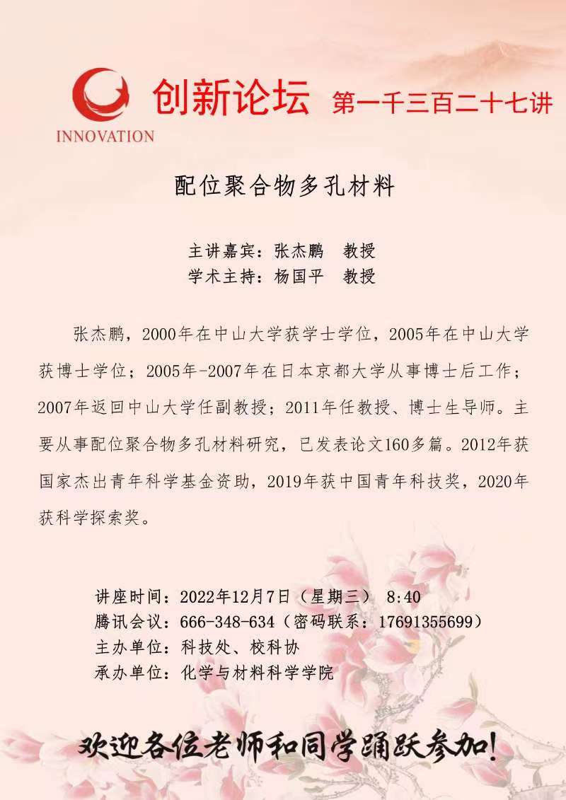 张杰鹏 教授 MILAN.COM创新论坛第一千三百二十七讲:配位聚合物多孔材料 讲座时间 2022年12月7日(星期三) 8:40 讲座地点 腾讯会议:666-348-634 讲座人介绍 张杰鹏 教授 讲座内容