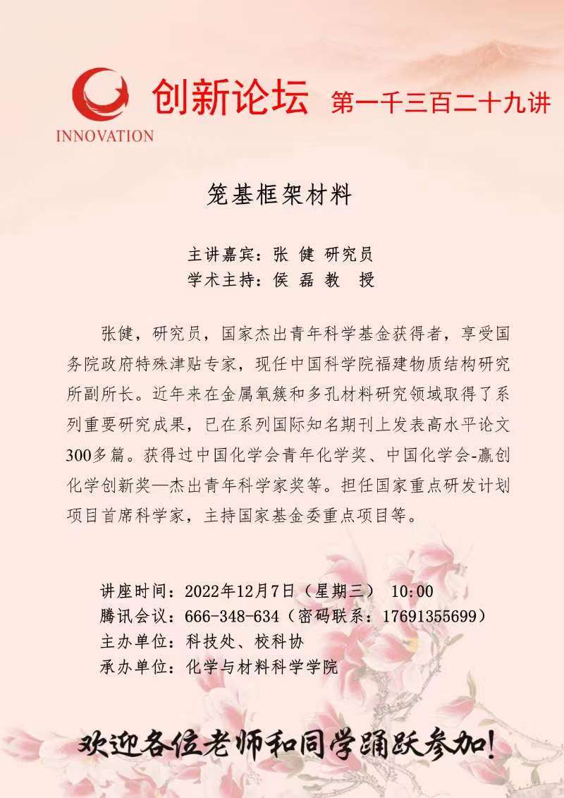 张健 研究员 MILAN.COM创新论坛第一千三百二十九讲:笼基框架材料 讲座时间 2022年12月7日(星期三) 10:00 讲座地点 腾讯会议:666-348-634 讲座人介绍 张健 研究员 讲座内容