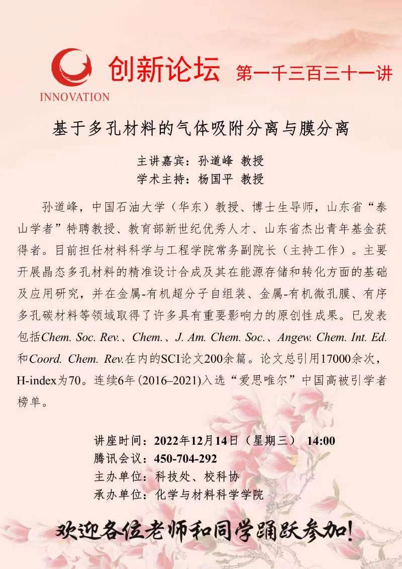 孙道峰 教授 MILAN.COM创新论坛第一千三百三十一讲:基于多孔材料的气体吸附分离与膜分离 讲座时间 2022年12月14日(星期三) 14:00 讲座地点 腾讯会议:450-704-292 讲座人介绍 孙道峰 教授 讲座内容