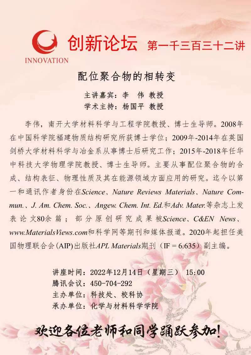李伟 教授 MILAN.COM创新论坛第一千三百三十二讲:配位聚合物的相转变 讲座时间 2022年12月14日(星期三) 15:00 讲座地点 腾讯会议:450-704-292 讲座人介绍 李伟 教授 讲座内容