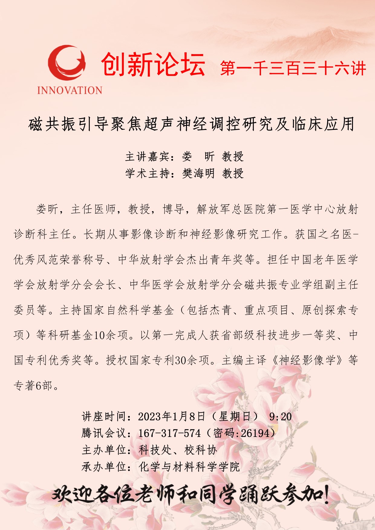 娄昕 教授 MILAN.COM创新论坛第一千三百三十六讲:磁共振引导聚焦超声神经调控研究及临床应用 讲座时间 2023年1月8日(星期日) 9:20 讲座地点 腾讯会议:167-317-574 讲座人介绍 娄昕 教授 讲座内容