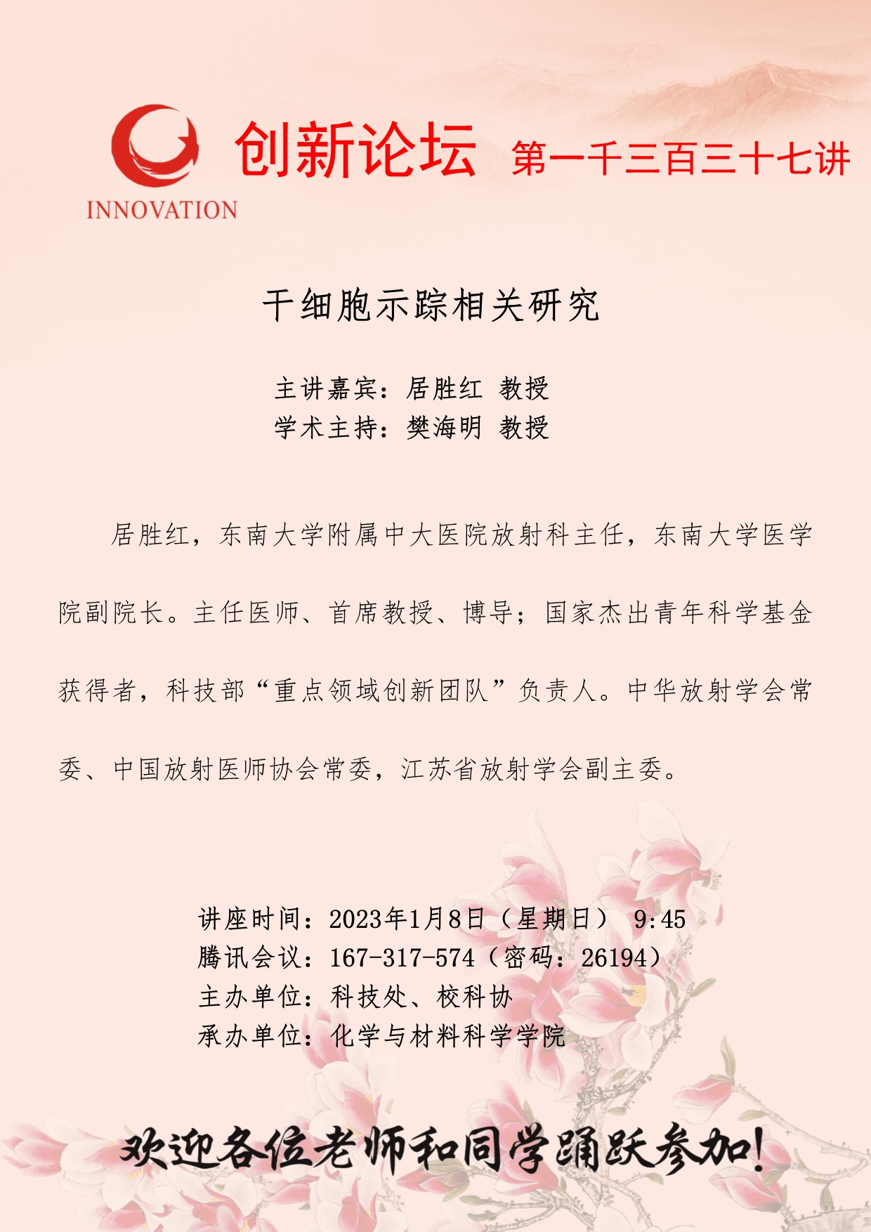 居胜红 教授 MILAN.COM创新论坛第一千三百三十七讲:干细胞示踪相关研究 讲座时间 2023年1月8日(星期日) 9:45 讲座地点 腾讯会议:167-317-574 讲座人介绍 居胜红 教授 讲座内容