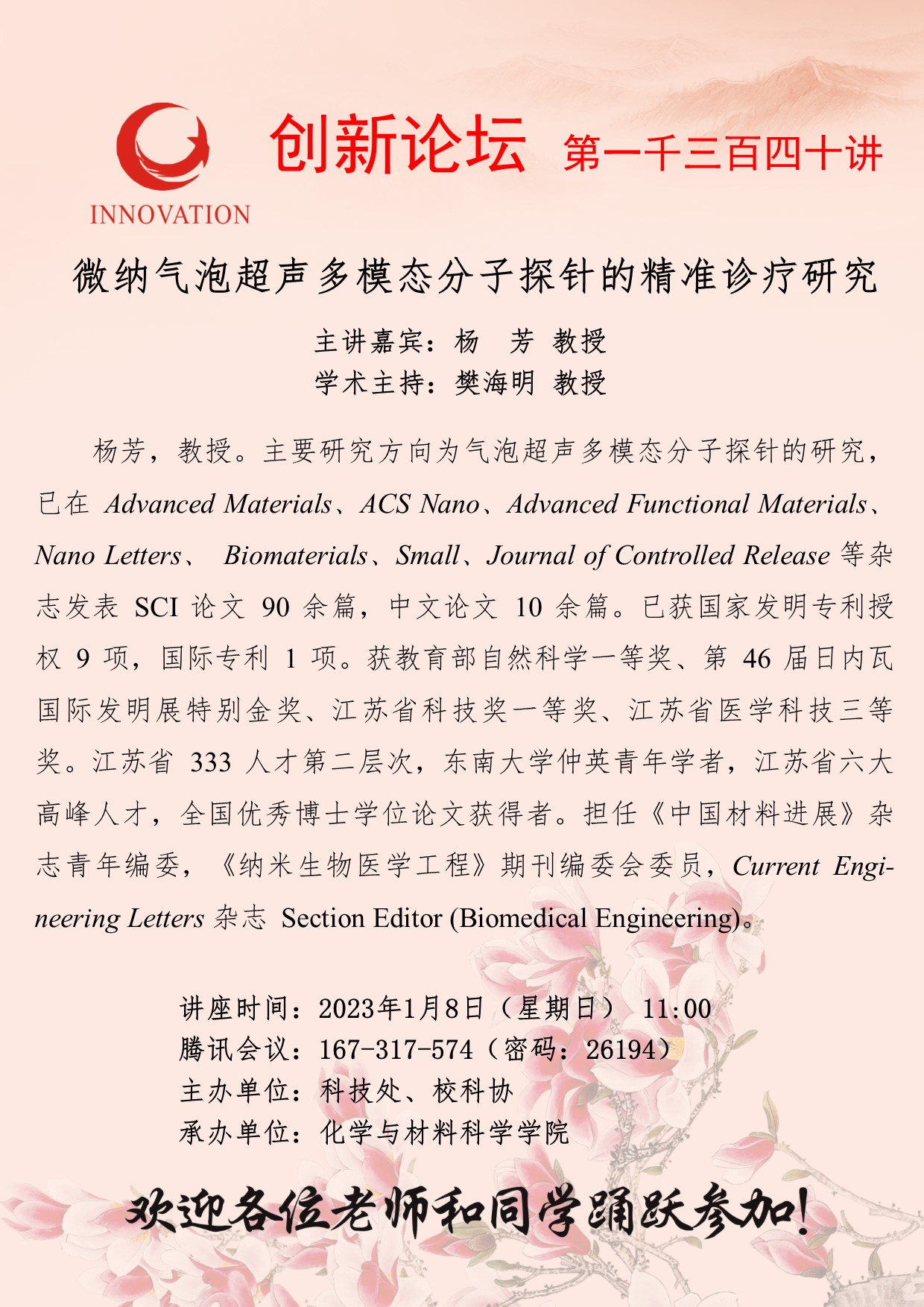 杨芳 教授 MILAN.COM创新论坛第一千三百四十讲:微纳气泡超声多模态分子探针的精准诊疗研究 讲座时间 2023年1月8日(星期日) 11:00 讲座地点 腾讯会议:167-317-574 讲座人介绍 杨芳 教授 讲座内容
