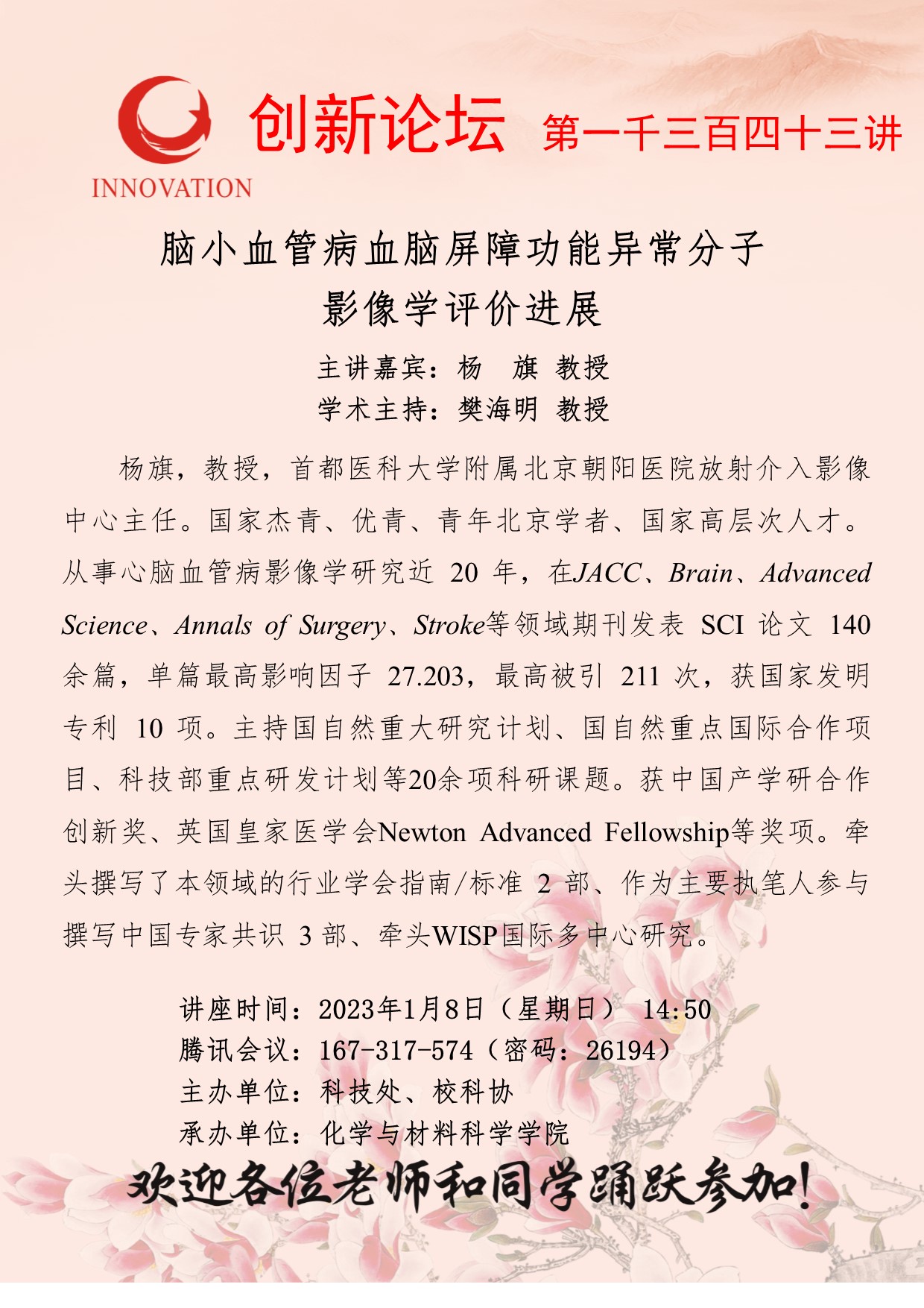 杨旗 教授 MILAN.COM创新论坛第一千三百四十三讲:脑小血管病血脑屏障功能异常分子影像学评价进展 讲座时间 2023年1月8日(星期日) 14:50 讲座地点 腾讯会议:167-317-574 讲座人介绍 杨旗 教授 讲座内容