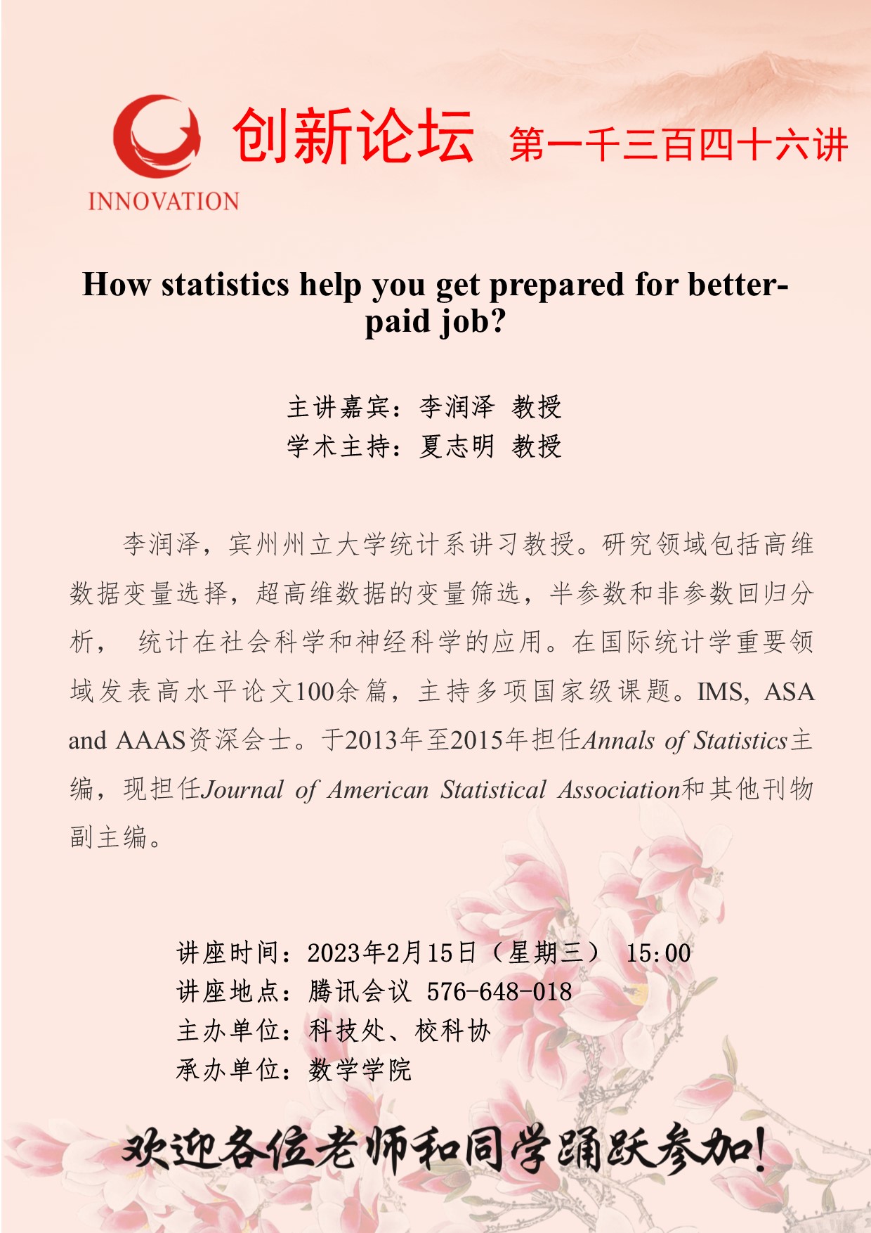 李润泽 教授 MILAN.COM创新论坛第一千三百四十六讲:How statistics help you get prepared for better-paid job? 讲座时间 2023年2月15日(星期三) 15:00 讲座地点 腾讯会议 576-648-018 讲座人介绍 李润泽 教授 讲座内容