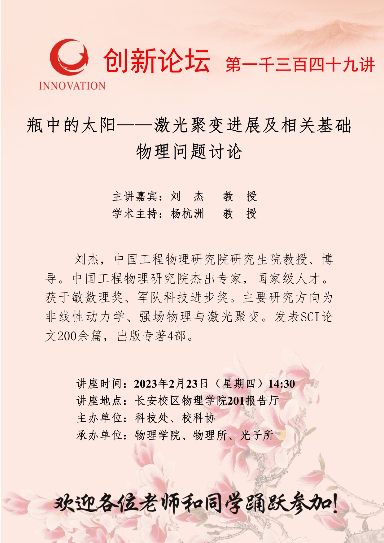 刘杰 教授 MILAN.COM创新论坛第一千三百四十九讲:瓶中的太阳——激光聚变进展及相关基础物理问题讨论 讲座时间 2023年2月23日(星期四)14:30 讲座地点 长安校区物理学院201报告厅 讲座人介绍 刘杰 教授 讲座内容