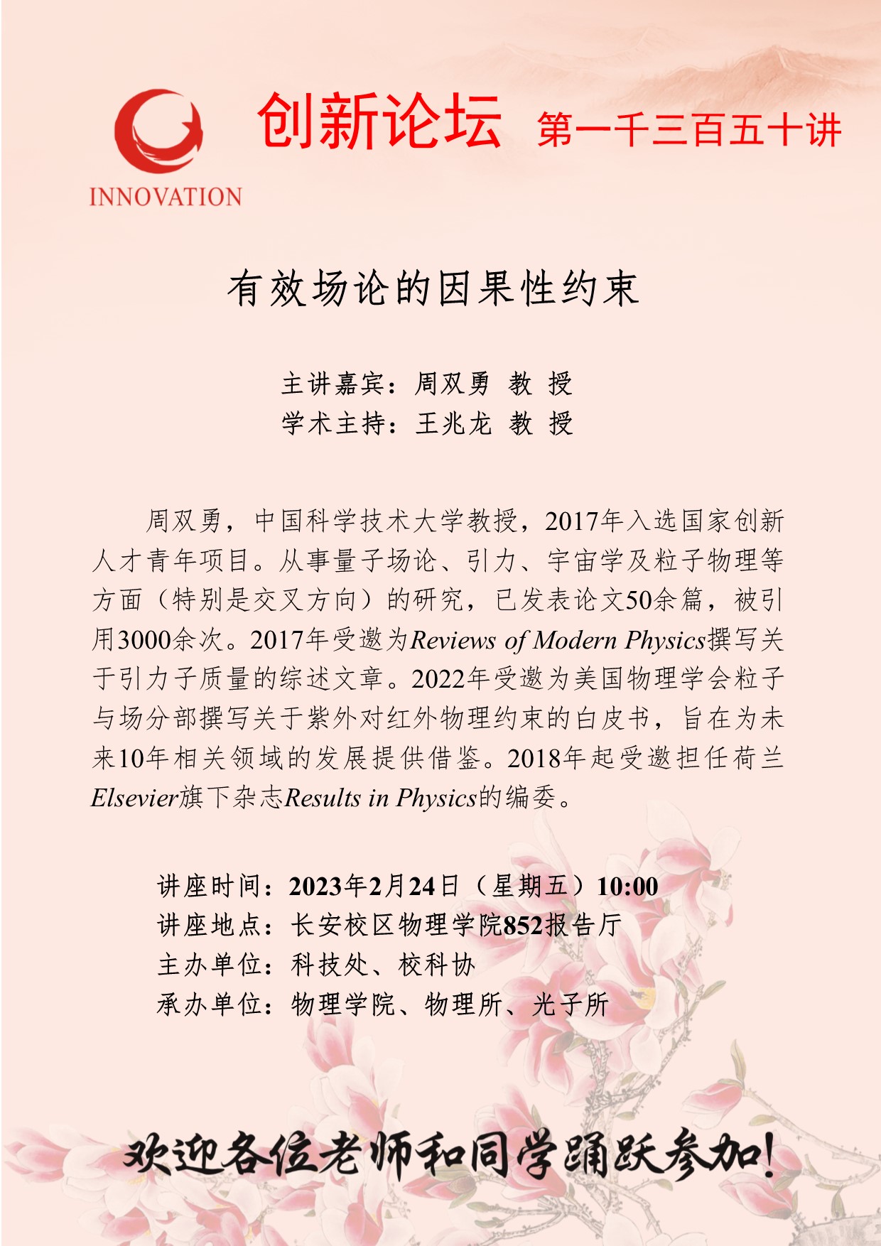 周双勇 教授 MILAN.COM创新论坛第一千三百五十讲: 有效场论的因果性约束 讲座时间 2023年2月24日(星期五)10:00 讲座地点 长安校区物理学院852报告厅 讲座人介绍 周双勇 教授 讲座内容