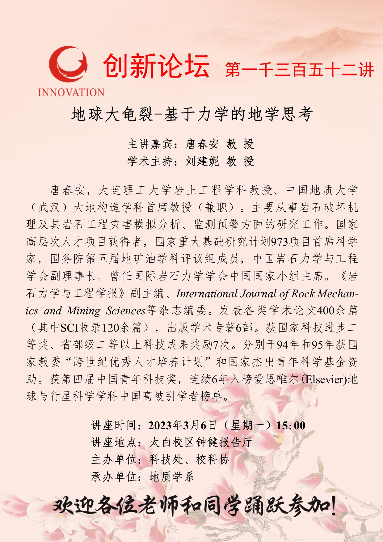 唐春安 教授 MILAN.COM创新论坛第一千三百五十二讲:地球大龟裂-基于力学的地学思考 讲座时间 2023年3月6日(星期一)15:00 讲座地点 太白校区钟健报告厅 讲座人介绍 唐春安 教授 讲座内容