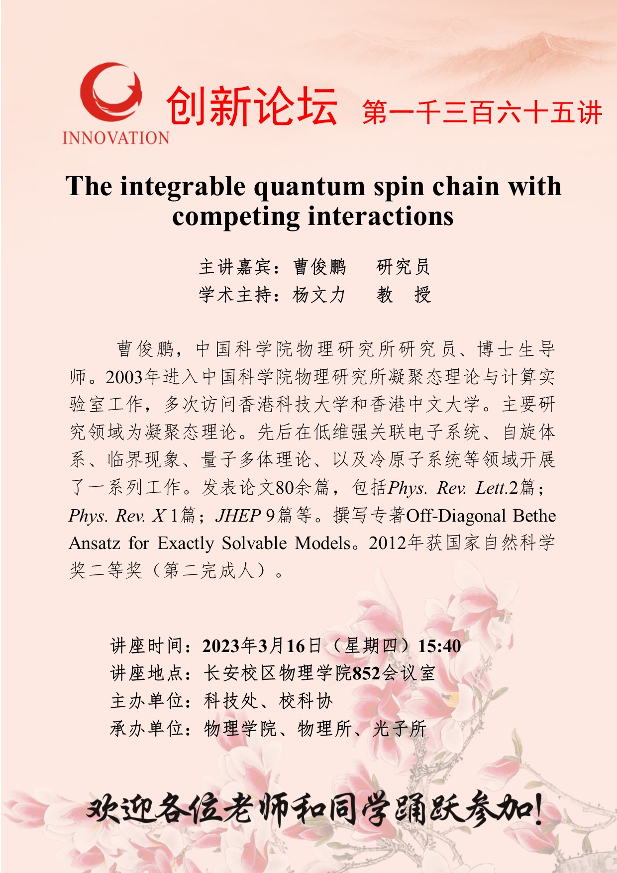 曹俊鹏 研究员 MILAN.COM创新论坛第一千三百六十五讲:The integrable quantum spin chain with competing interactions 讲座时间 2023年3月16日(星期四)15:40 讲座地点 长安校区物理学院852会议室 讲座人介绍 曹俊鹏 研究员 讲座内容