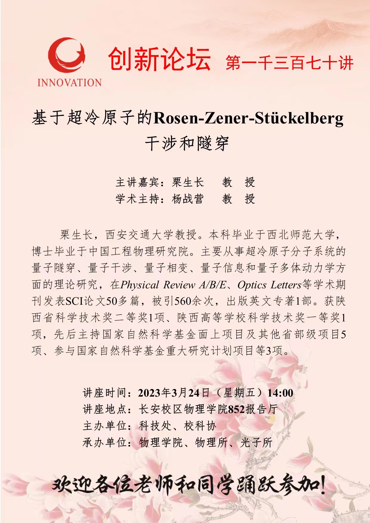 栗生长 教 授 MILAN.COM创新论坛第一千三百七十讲:基于超冷原子的Rosen-Zener-Stückelberg干涉和隧穿 讲座时间 2023年3月24日(星期五)14:00 讲座地点 长安校区物理学院852报告厅 讲座人介绍 栗生长 教 授 讲座内容