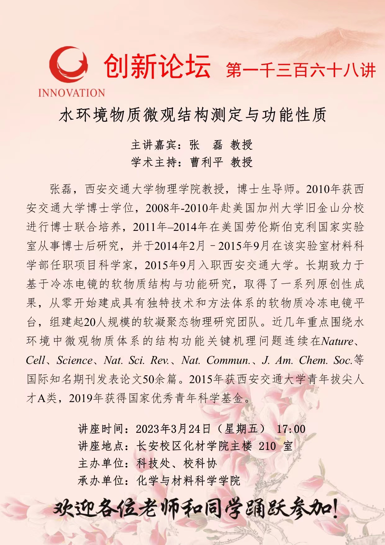 张磊 教授 MILAN.COM创新论坛第一千三百六十八讲:水环境物质微观结构测定与功能性质机理 讲座时间 2023年3月24日(星期五) 17:00 讲座地点 长安校区化材学院主楼 210 室 讲座人介绍 张磊 教授 讲座内容