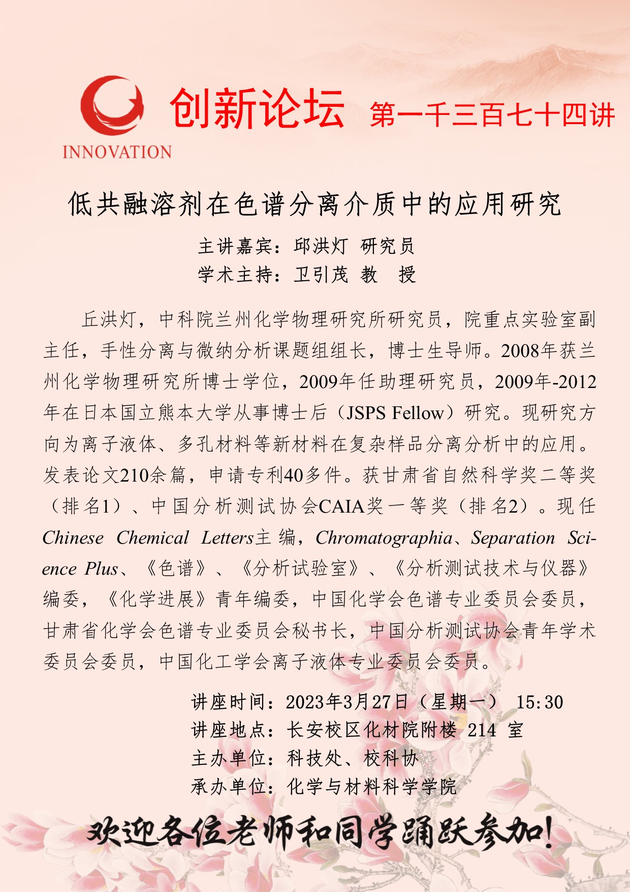 邱洪灯 研究员 MILAN.COM创新论坛第一千三百七十四讲:低共融溶剂在色谱分离介质中的应用研究 讲座时间 2023年3月27日(星期一) 15:30 讲座地点 长安校区化材院附楼214室 讲座人介绍 邱洪灯 研究员 讲座内容