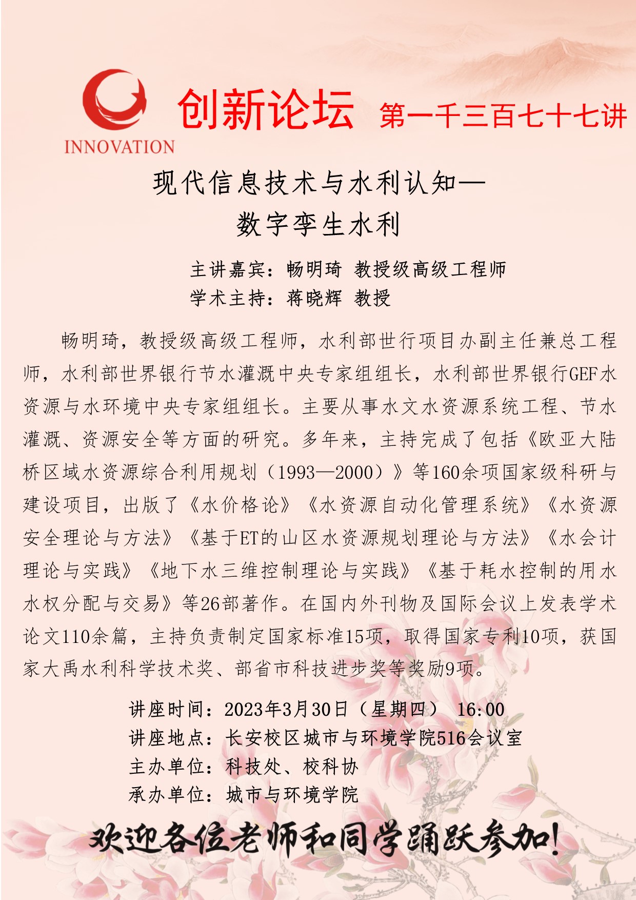 畅明琦 教授级高级工程师 MILAN.COM创新论坛第一千三百七十七讲:现代信息技术与水利认知—数字孪生水利 讲座时间 2023年3月30日(星期四) 16:00 讲座地点 长安校区城市与环境学院516会议室 讲座人介绍 畅明琦 教授级高级工程师 讲座内容