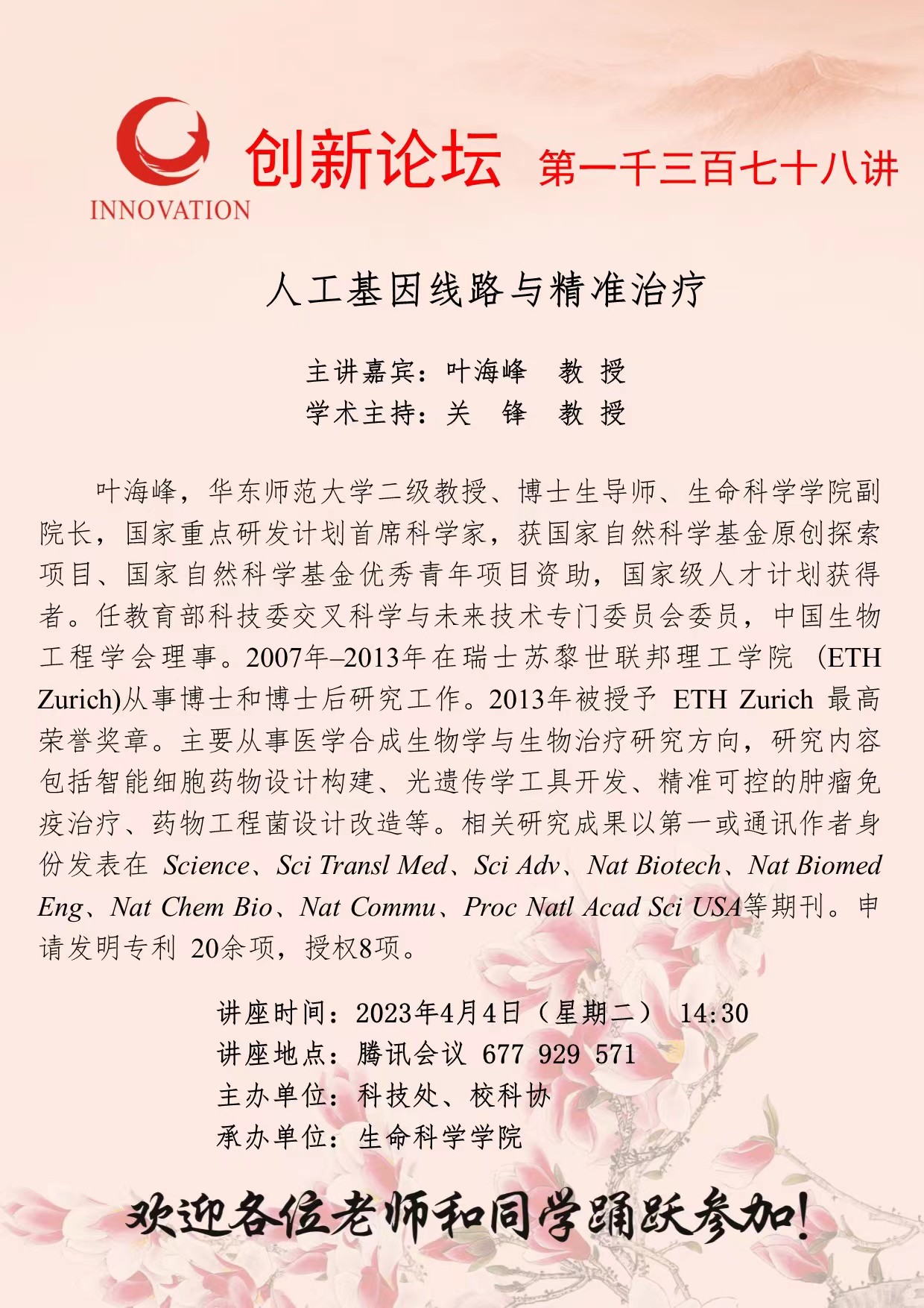 叶海峰 教授 MILAN.COM创新论坛第一千三百七十八讲:人工基因线路与精准治疗 讲座时间 2023年4月4日(星期二) 14:30 讲座地点 腾讯会议 677 929 571 讲座人介绍 叶海峰 教授 讲座内容