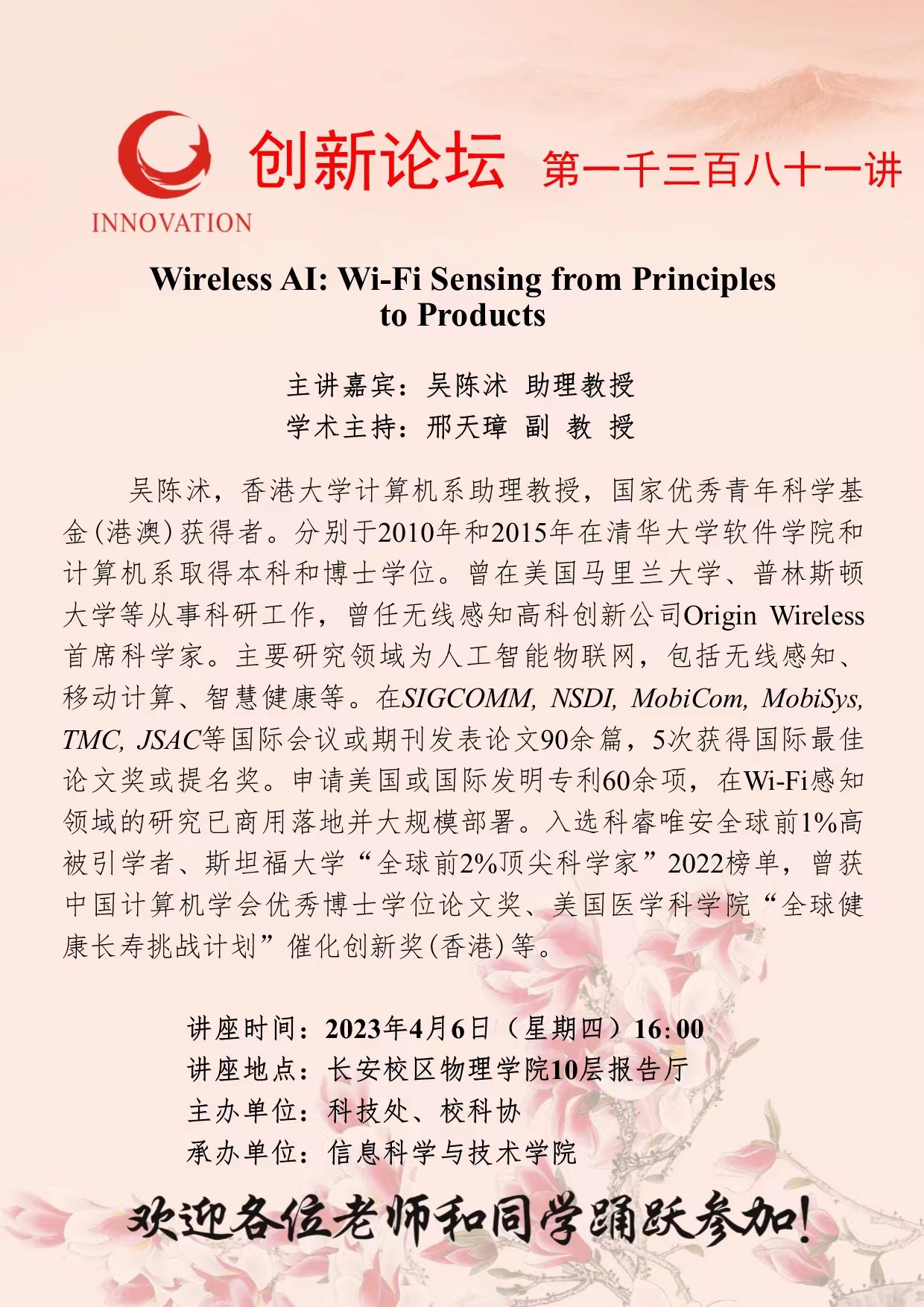 吴陈沭 助理教授 MILAN.COM创新论坛第一千三百八十一讲:Wireless AI: Wi-Fi Sensing from Principles to Products 讲座时间 2023年4月6日(星期四)16:00 讲座地点 长安校区物理学院10层报告厅 讲座人介绍 吴陈沭 助理教授 讲座内容