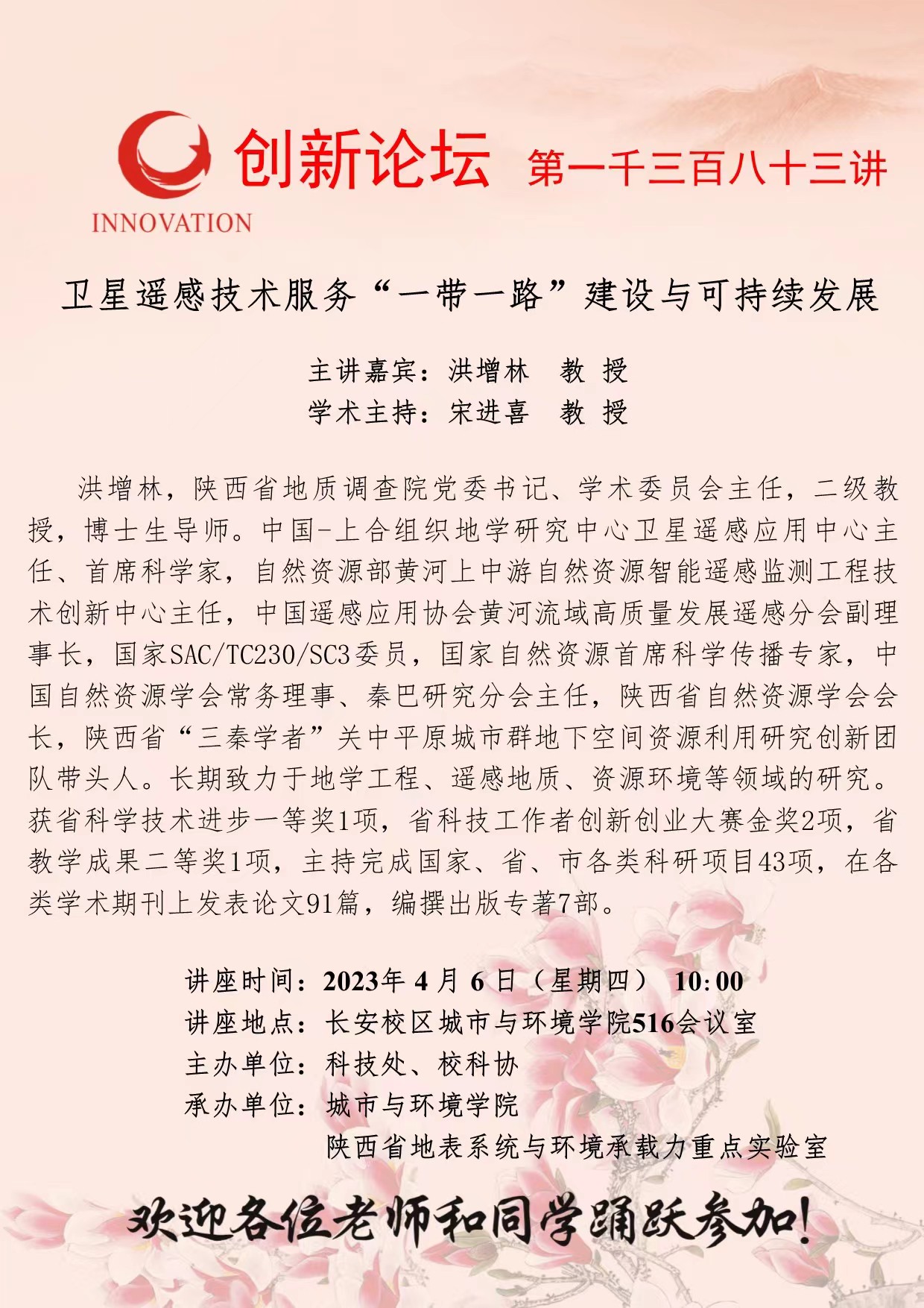洪增林 教 授 MILAN.COM创新论坛第一千三百八十三讲:卫星遥感技术服务“一带一路”建设与可持续发展 讲座时间 2023年 4 月 6 日(星期四) 10:00 讲座地点 长安校区城市与环境学院516会议室 讲座人介绍 洪增林 教 授 讲座内容