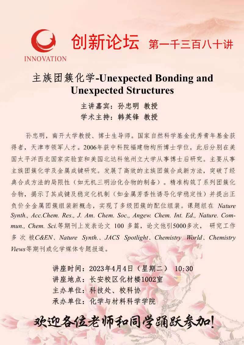 孙忠明 教授 MILAN.COM创新论坛第一千三百八十讲:主族团簇化学-Unexpected Bonding and Unexpected Structures 讲座时间 2023年4月4日(星期二) 10:30 讲座地点 长安校区化材楼1002室 讲座人介绍 孙忠明 教授 讲座内容